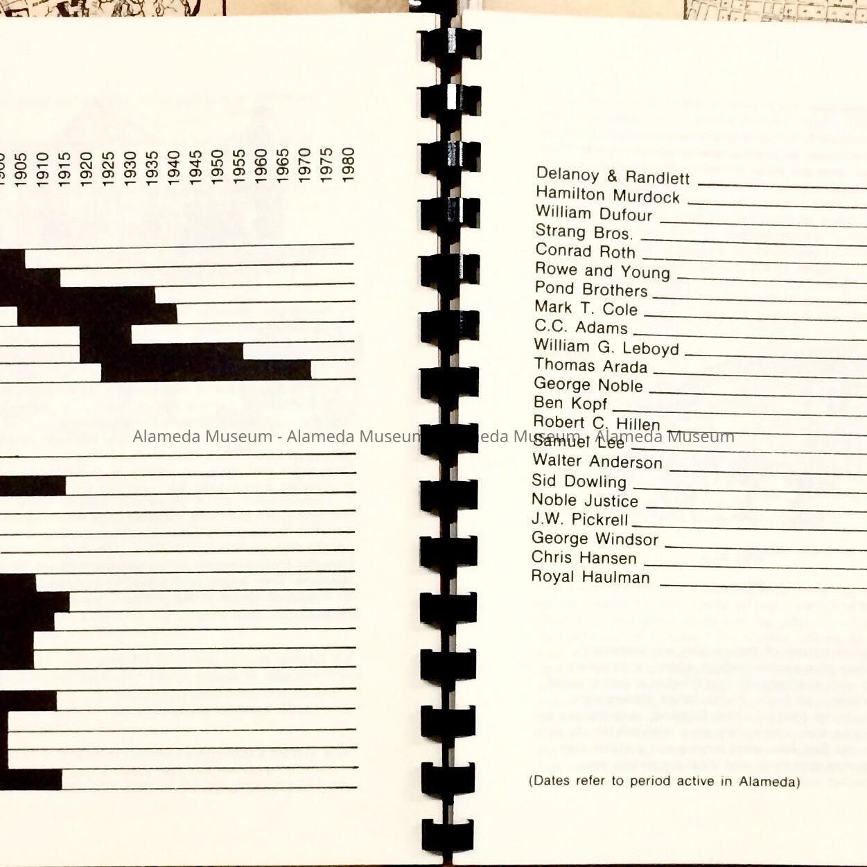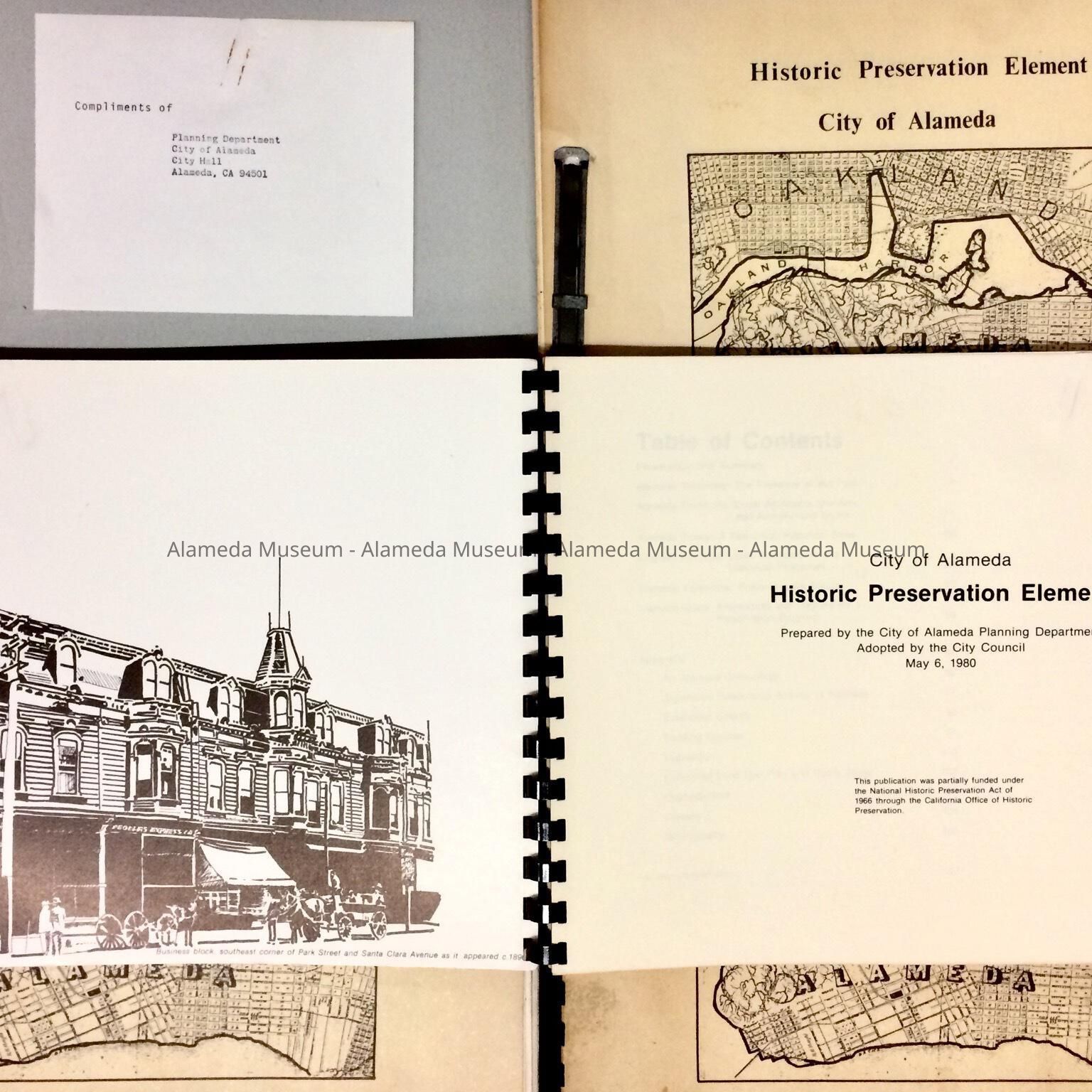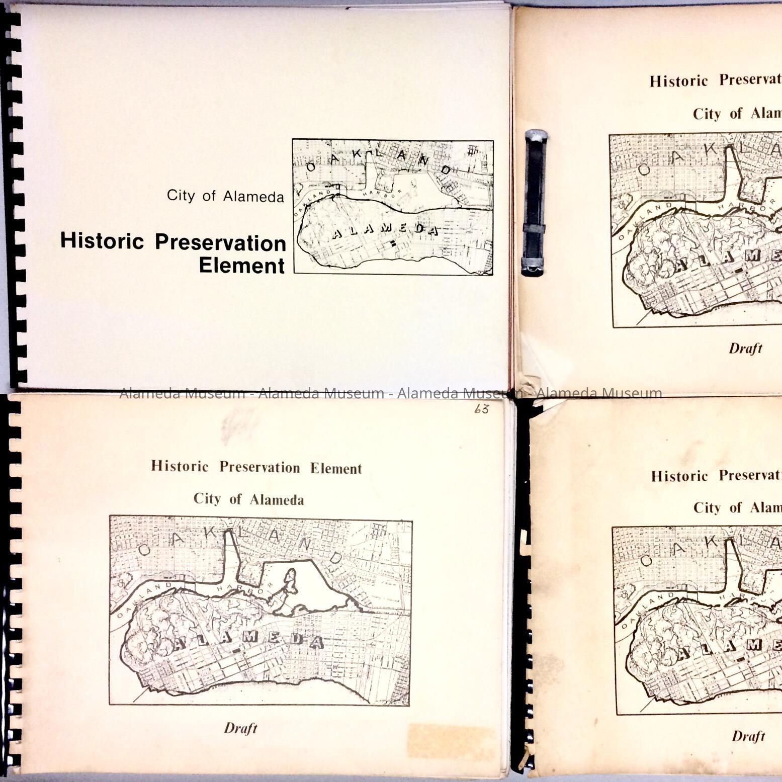 A. REPORT, IN BOOKLET FORM, WITH SOFT COVER AND CONTENTS SECURED BY BLACK-COLORED PLASTIC SPIRAL BINDING. COVER HAS BOLD-PRINTED CAPTION, "HISTORICAL PRESERVATION ELEMENT, CITY OF ALAMEDA," ON COVER. ALSO INCLUDED IS A REPRODUCTION OF AN EARLY MAP OF THE CITY.