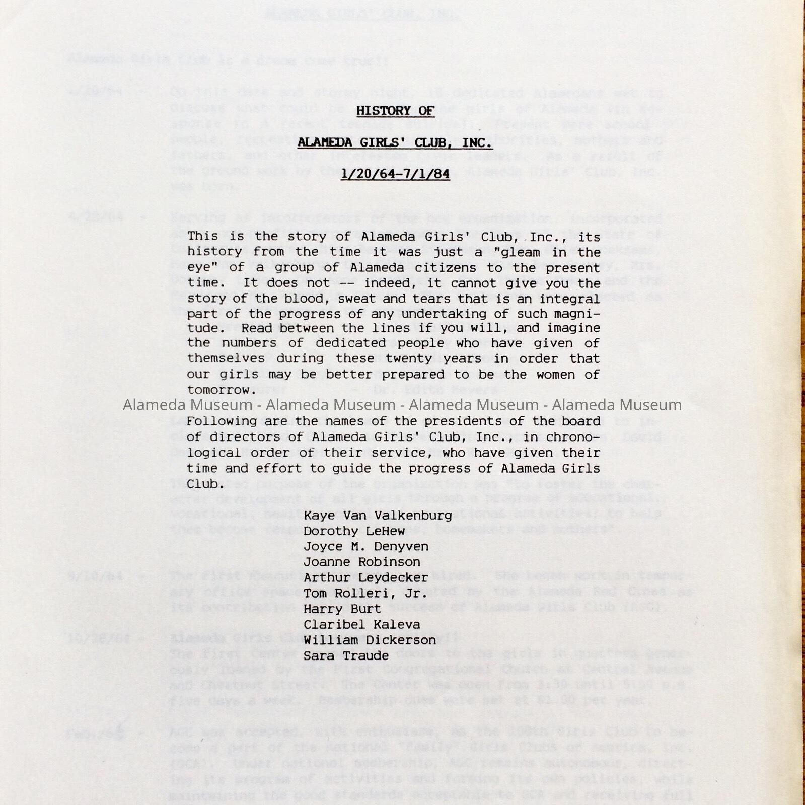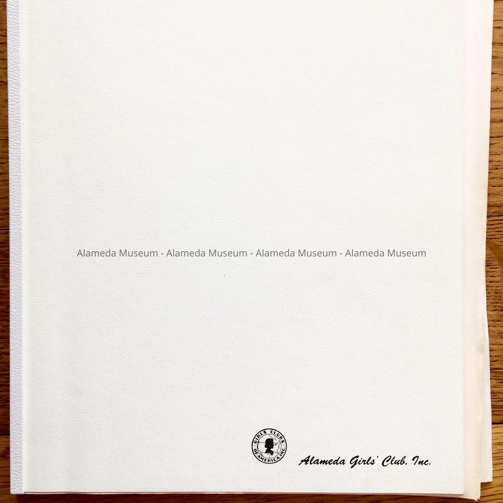 Description: Soft bound report. Cover has bold printed caption "Alameda Girl Club, Inc." in black colored type on a white colored background.