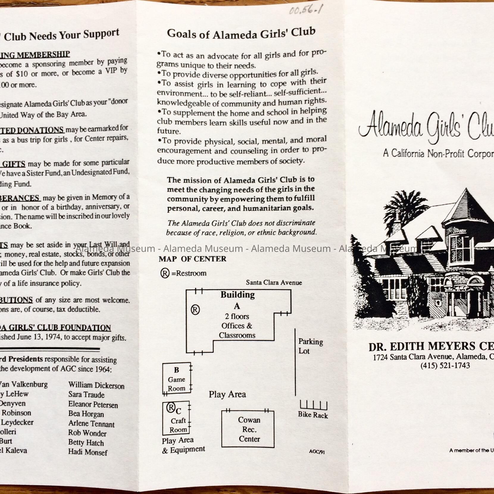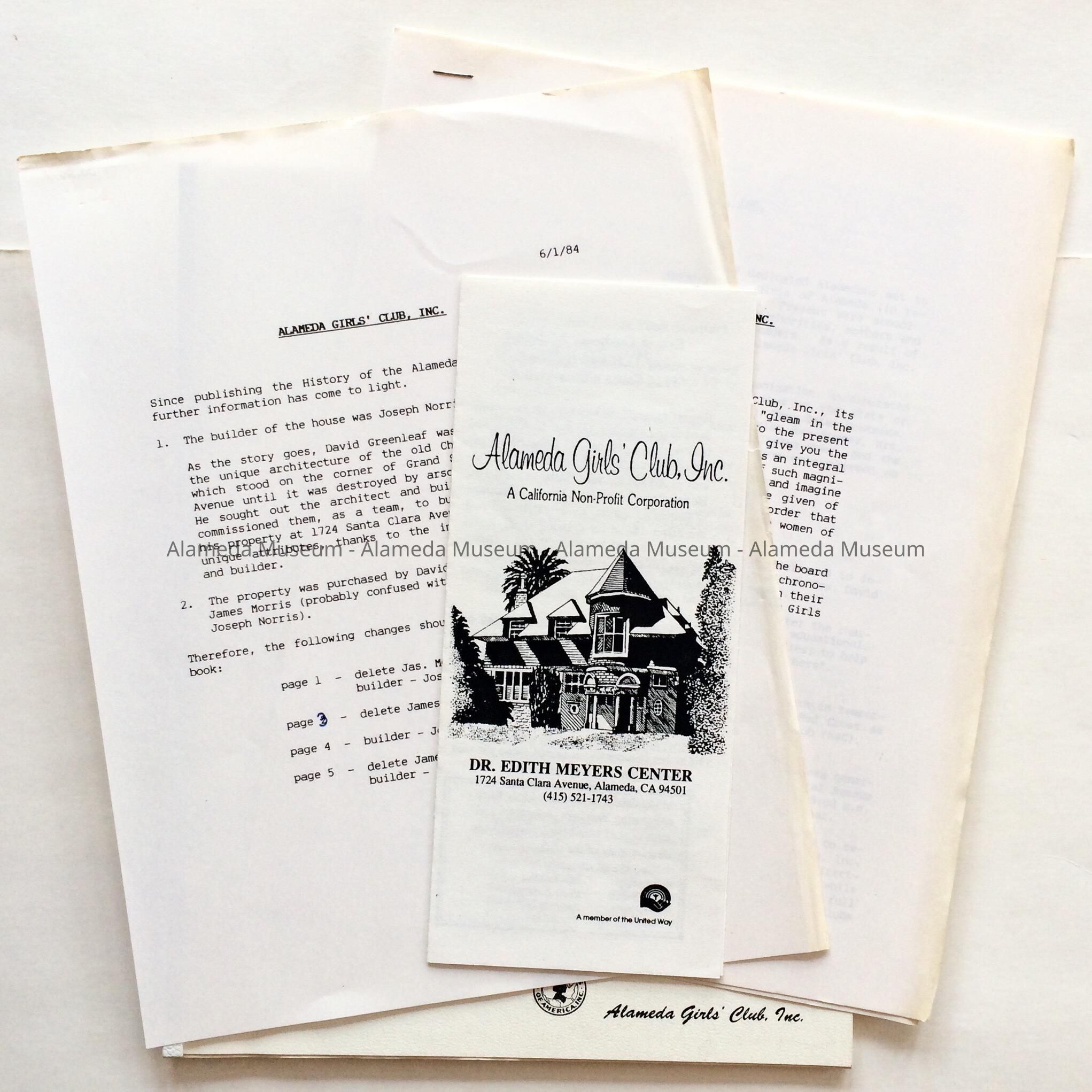 History: Illustrated report and history on 1724 Santa Clara Avenue erected in 1891 and now known as the Dr. Edith Meyers Center, Alameda Girls Club.