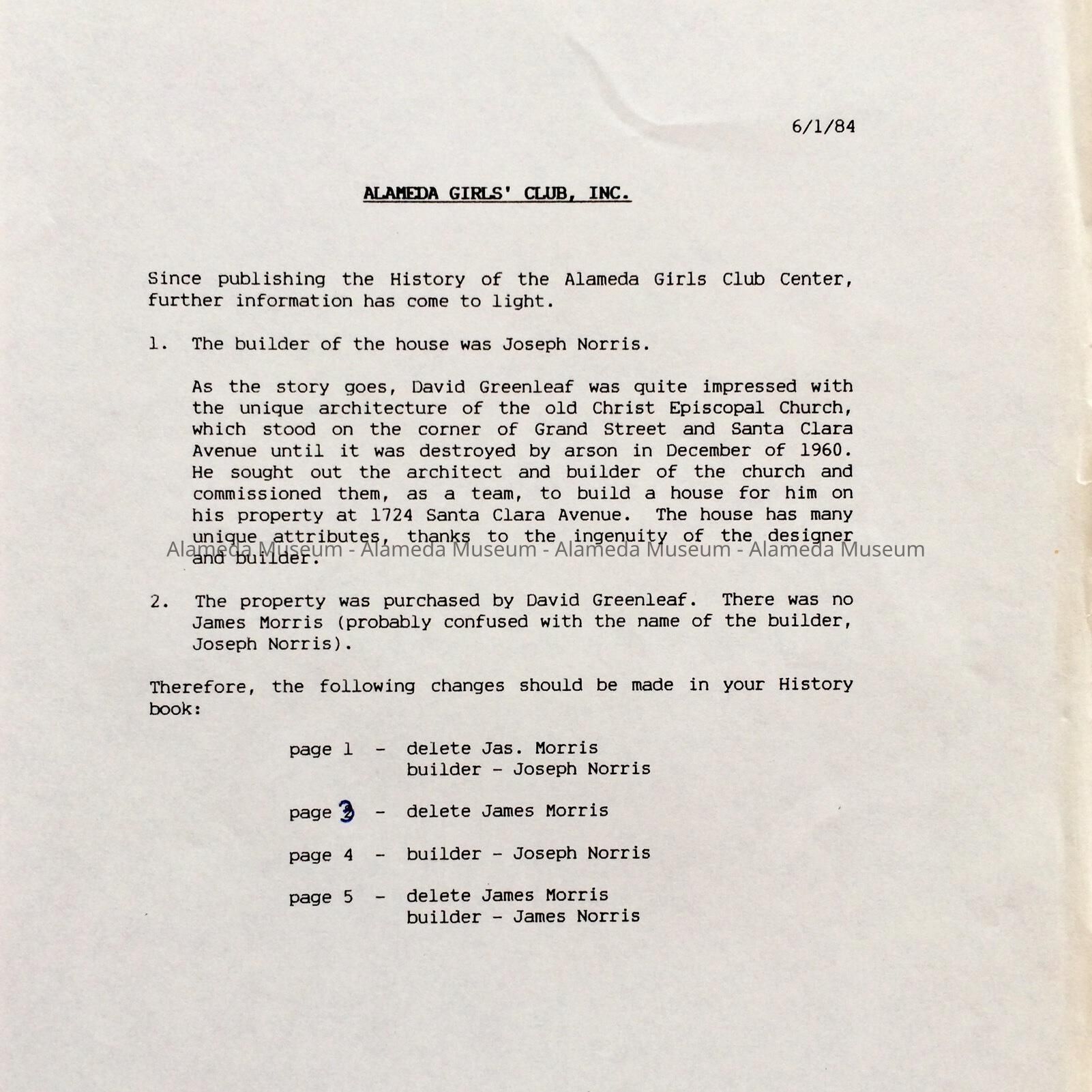 Report and history on 1724 Santa Clara Ave, 1984Entry/Object ID