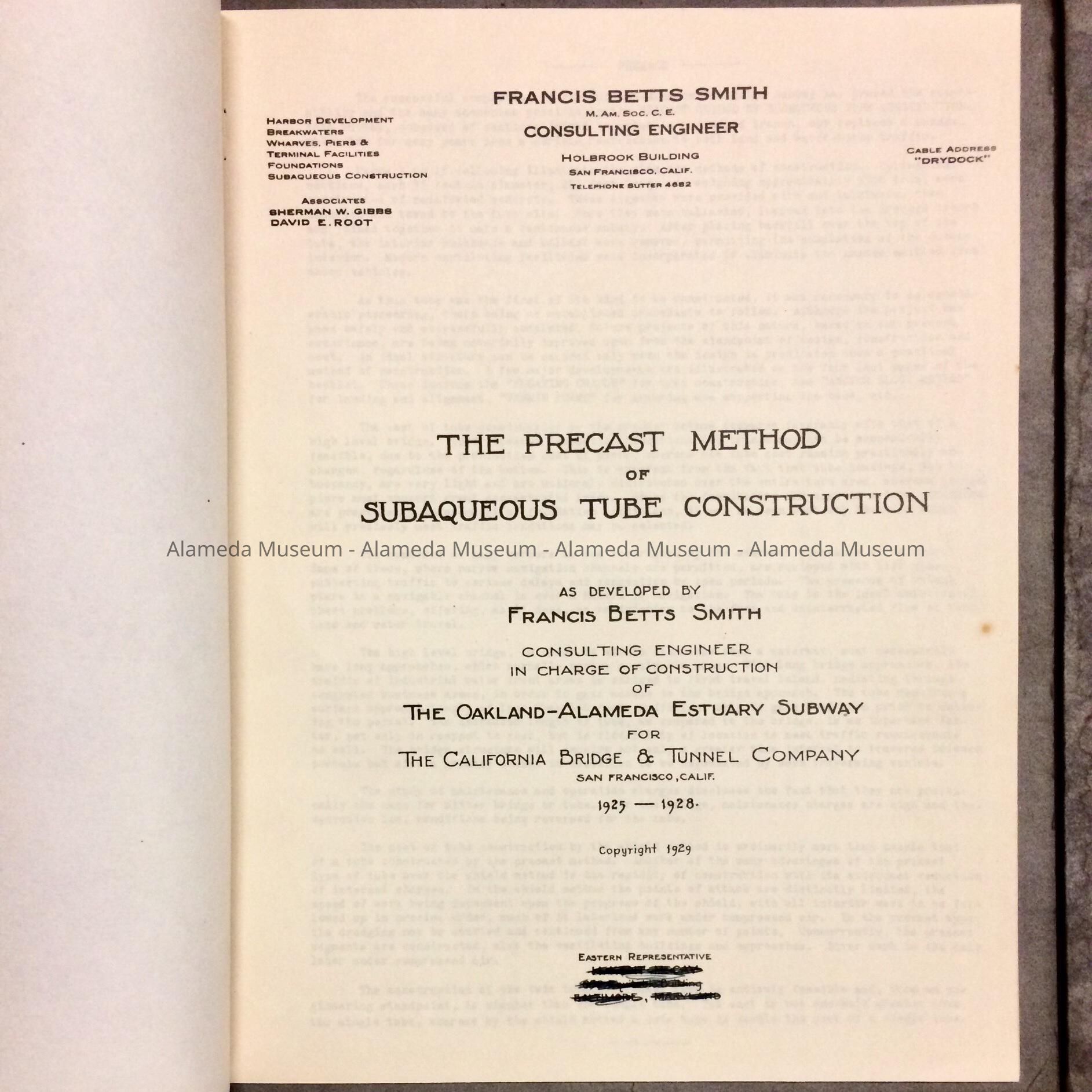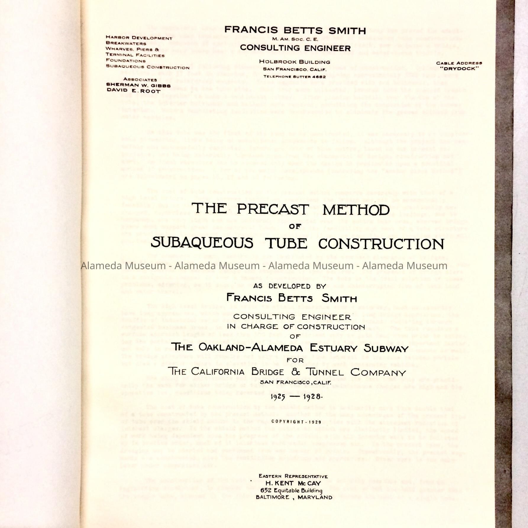 A REPORT ENTITLED "PRECAST METHOD OF SUBAQUEOUS TUBE CONSTRUCTION," AS DEVELOPED BY FRANCIS BETTS SMITH, CONSULTING ENGINEER-IN-CHARGE OF CONSTRUCTION OF THE OAKLAND-ALAMEDA ESTUARY SUBWAY (TUBE) FOR THE CALIFORNIA BRIDGE AND TUNNEL COMPANY, SAN FRANCISCO, CA, 1925-1928.