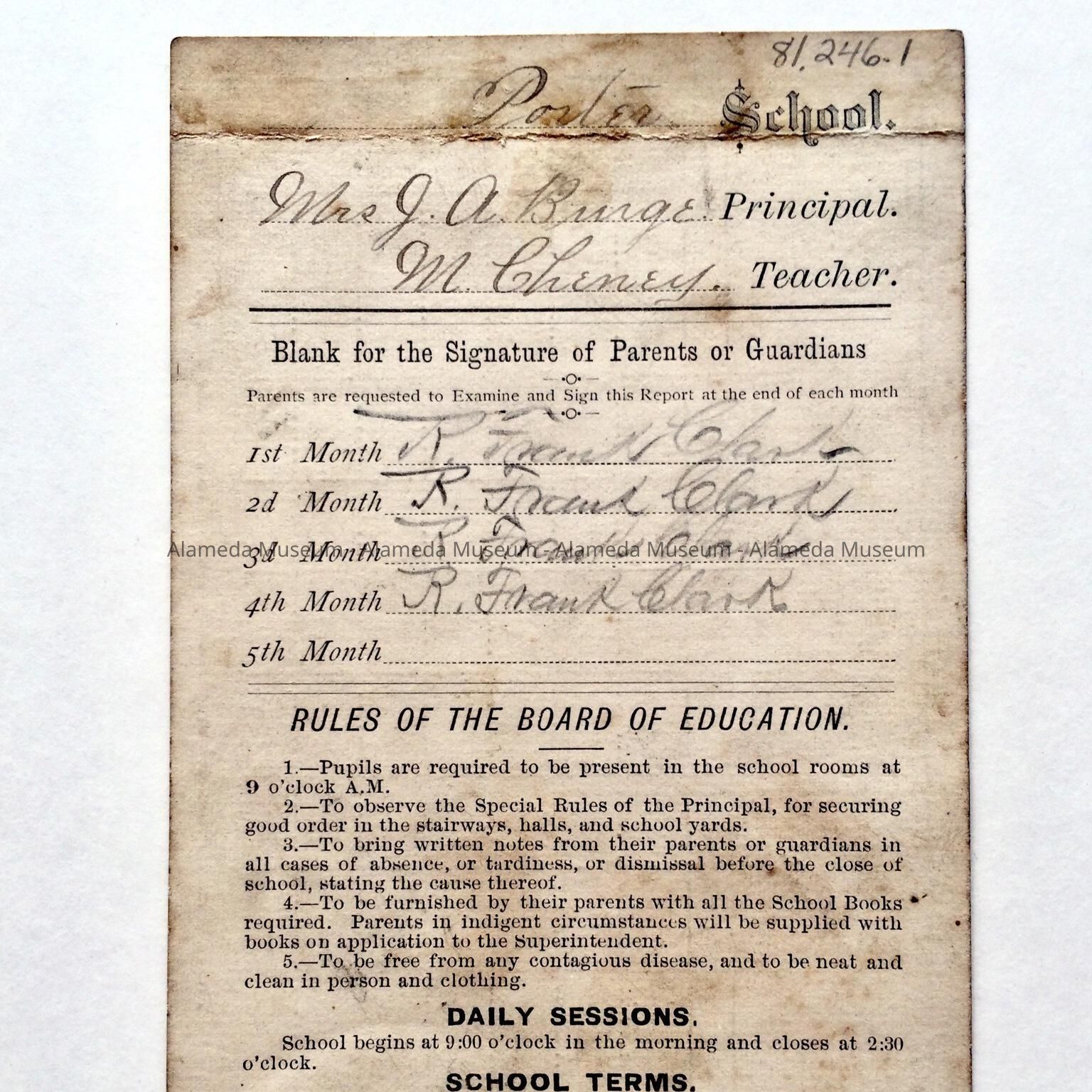 History of Object: It is the report card of Herbert D. Clark, 5th Grade, Porter School, 1886. Mrs. J. A. Burge, Principal, M. Cheney, Teacher.