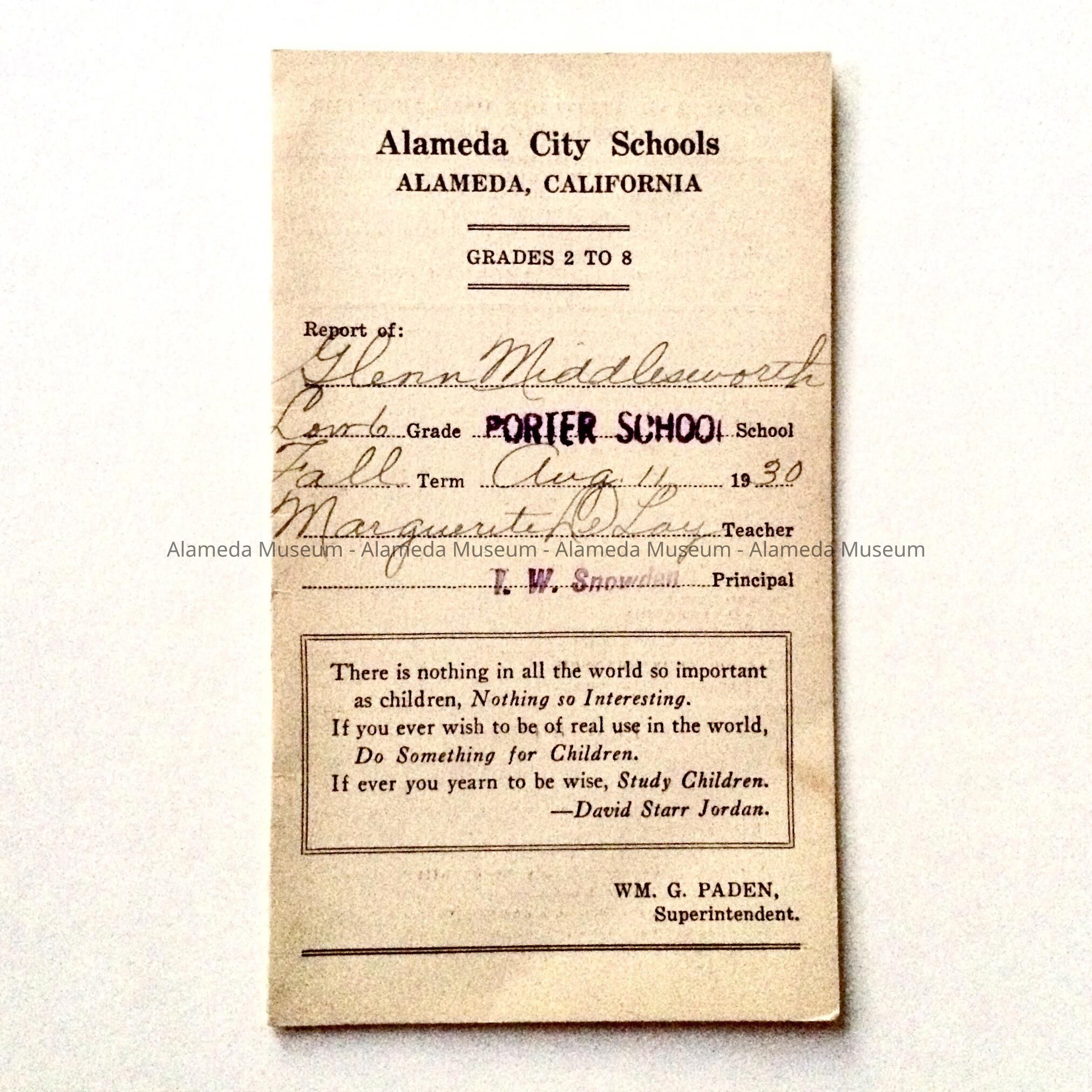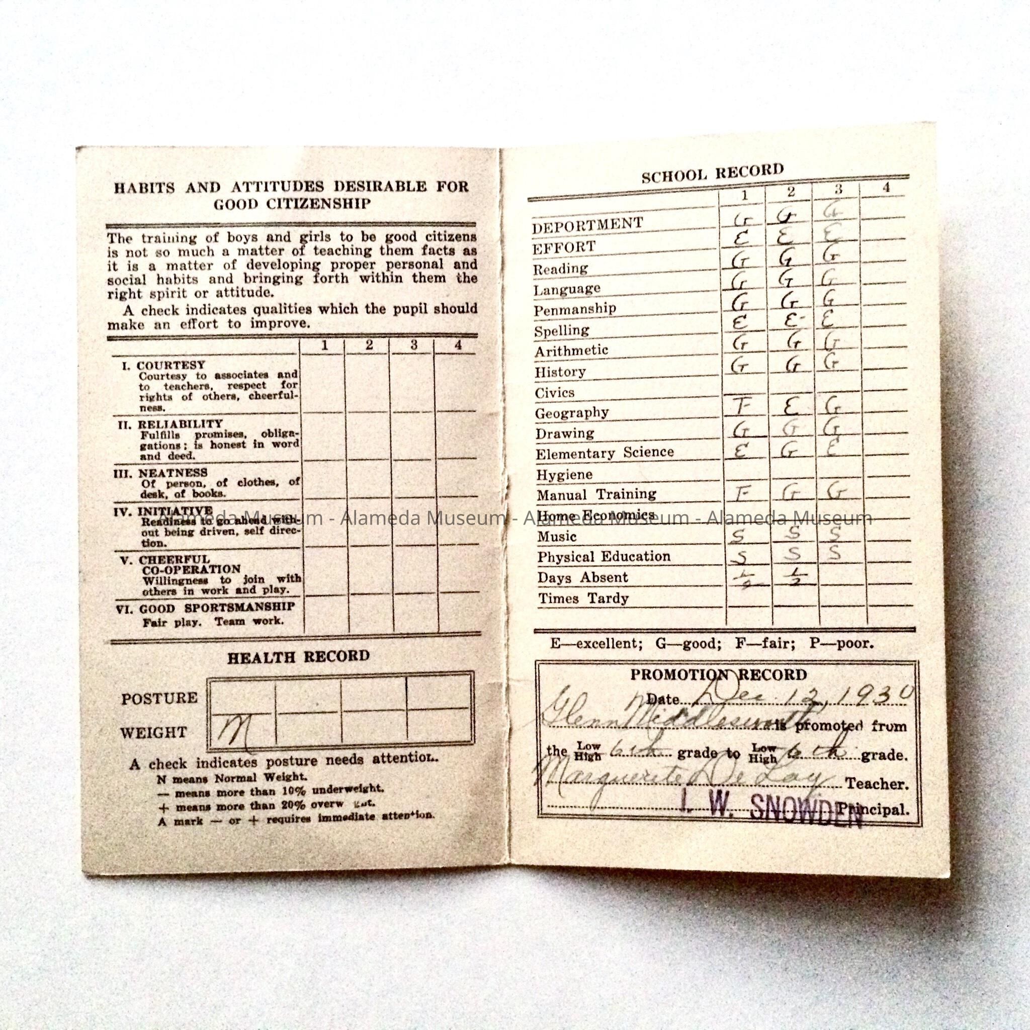 Description: Booklet type (2 pages) report card, bold caption "Alameda City Schools". Cover- report of, name, grade, etc. Interior, grades, back cover- parent signature.