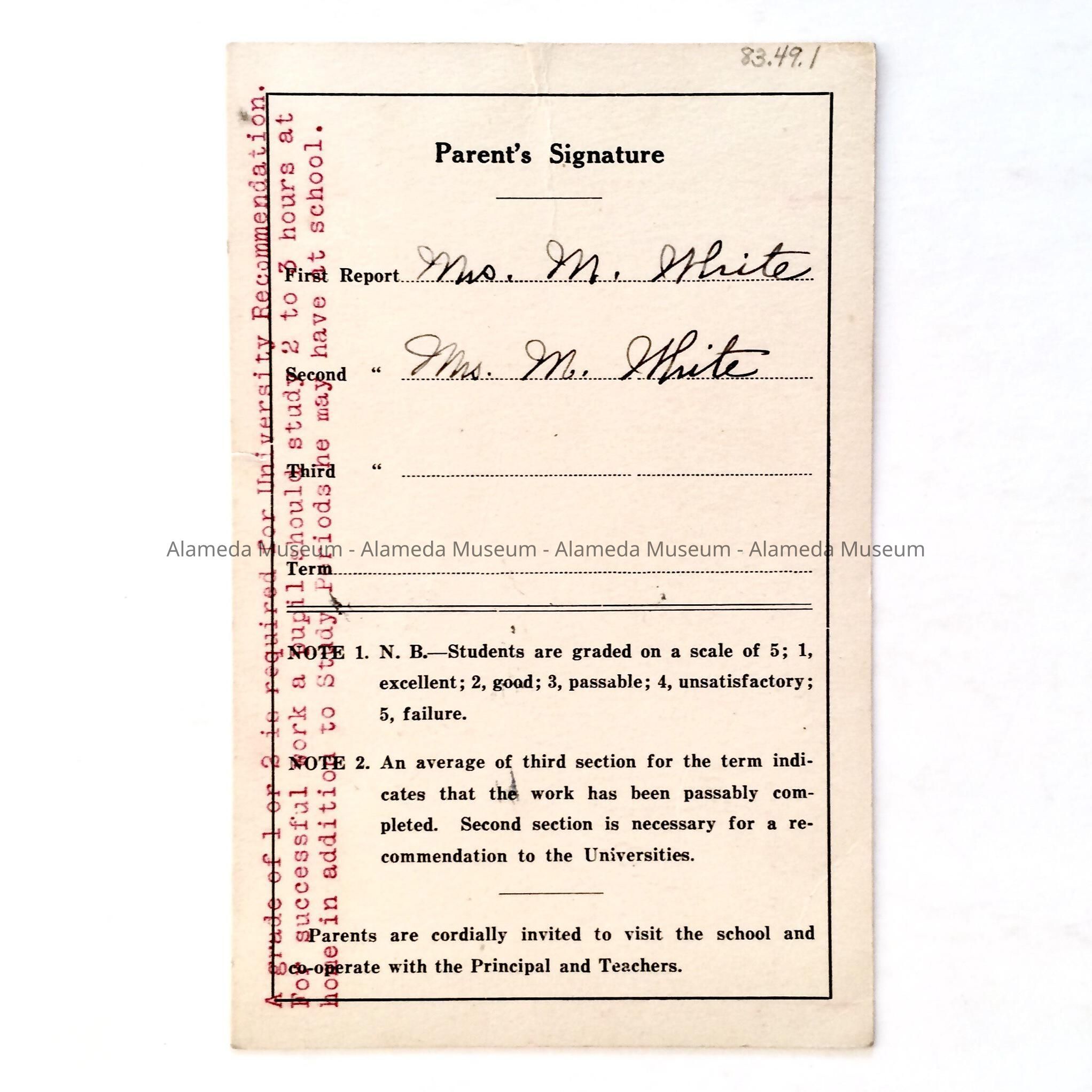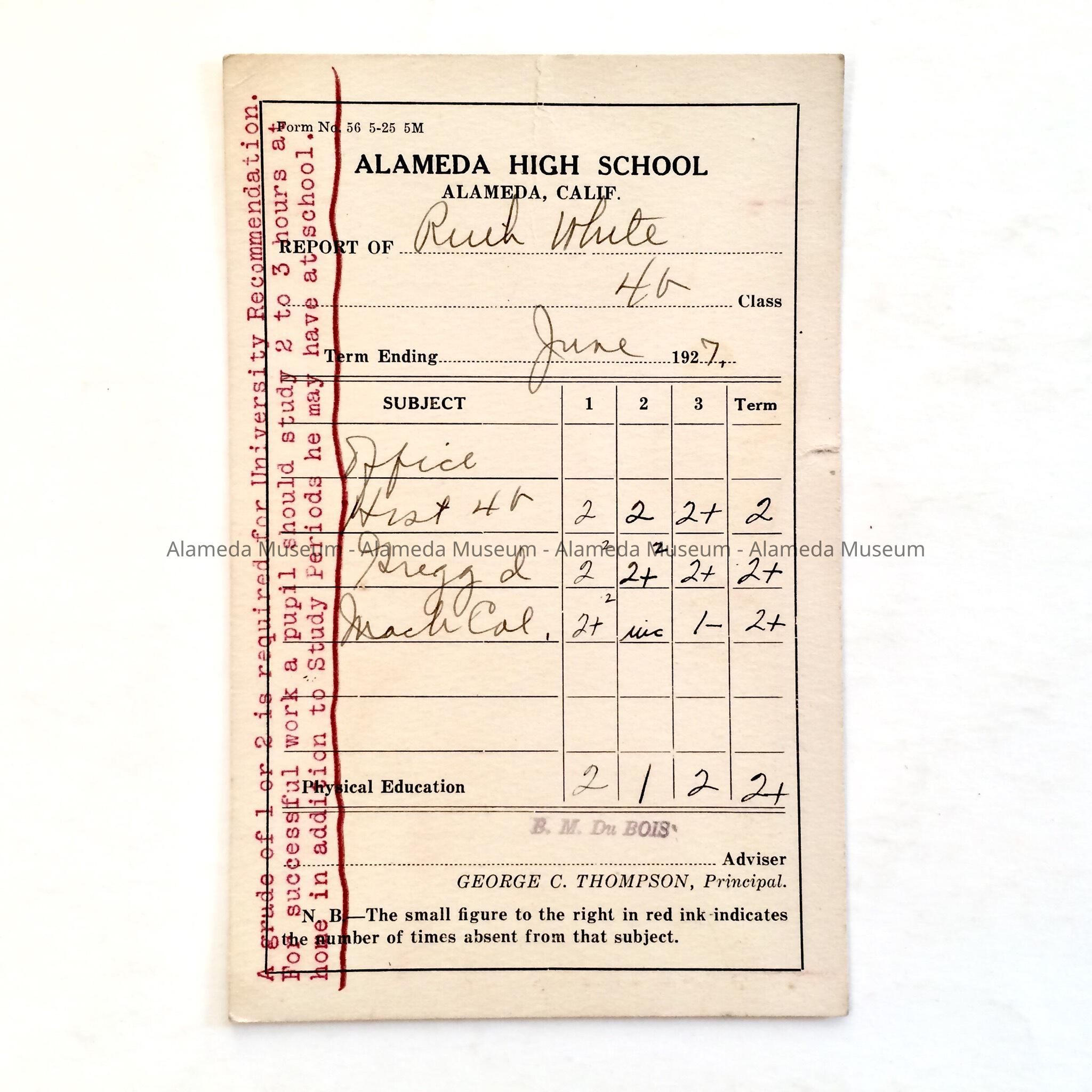 Report Card Ruth White, Alameda High School, June 1927Entry/Object ID
