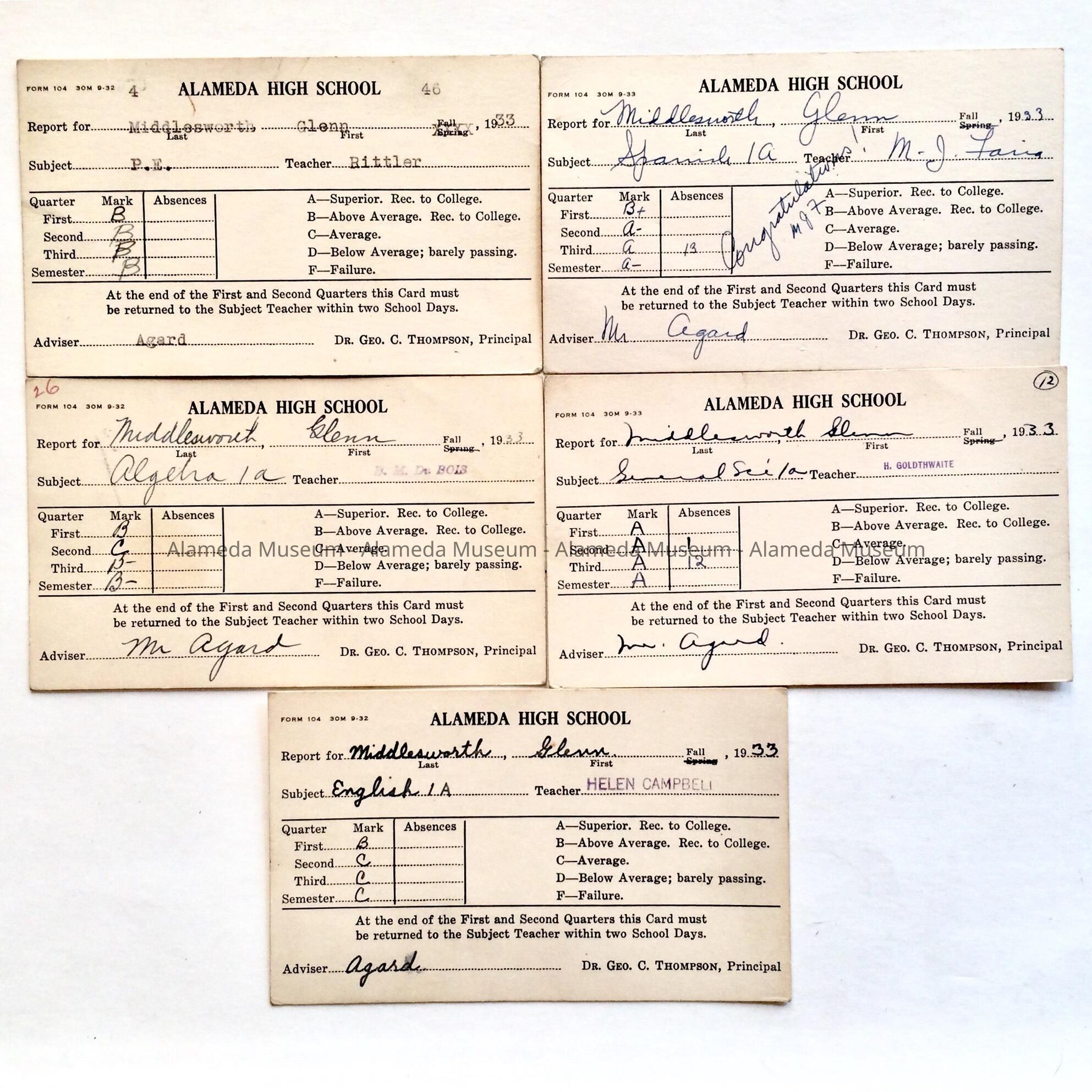 History of Object: Report cards (5) of Glenn Middlesworth, Alameda High School, Fall session, 1933