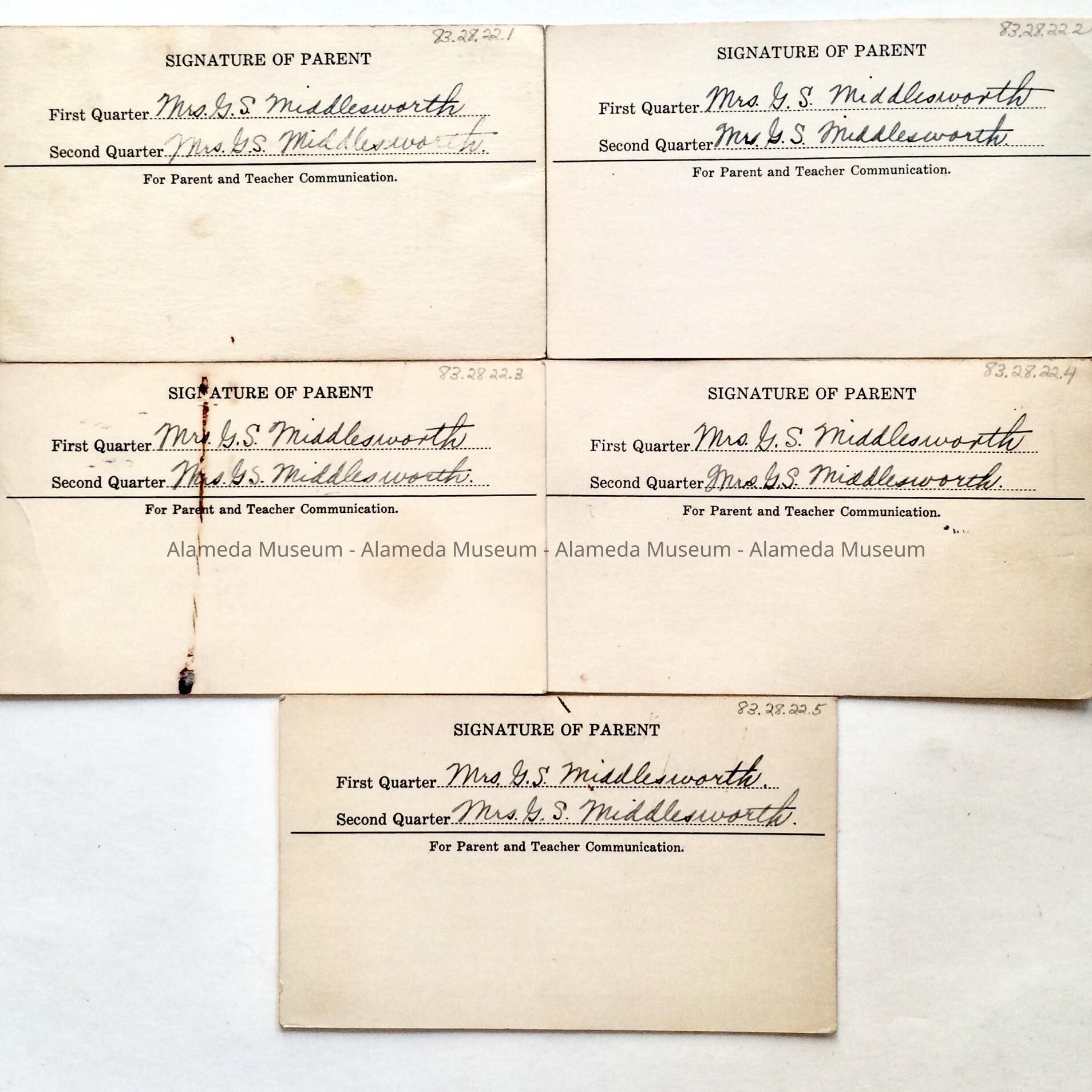 Description: 83.28.22.1 through 5, printed report cards with blanks for transcribing information (grade, teacher, parents signature, etc.), bold caption "Alameda High School". Information transcribed in blue ink (one typed).