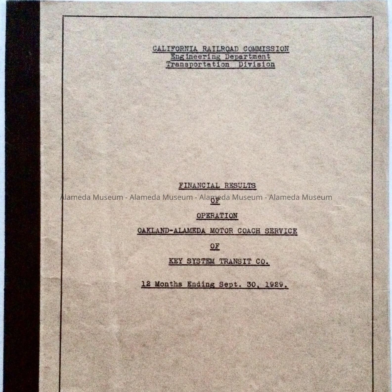 HISTORY OF OBJECT: A REPORT CONCERNING FINANCES OF ROUTES, ETC., OF THE OAKLAND-ALAMEDA MOTOR COACH SERVICES OF THE KEY SYSTEM TRANSIT COMPANY FOR A 12-MONTH PERIOD ENDING DECEMBER 30, 1929.