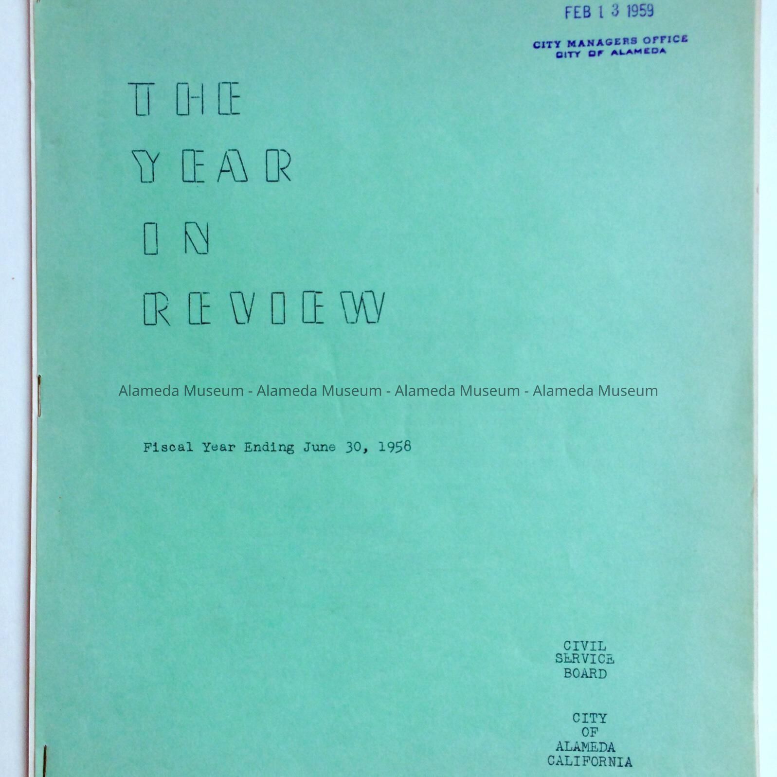 Description: staple-bound report with light turquoise paper front cover, titled ‘The Year in Review - Fiscal Year Ending June 30, 1958,