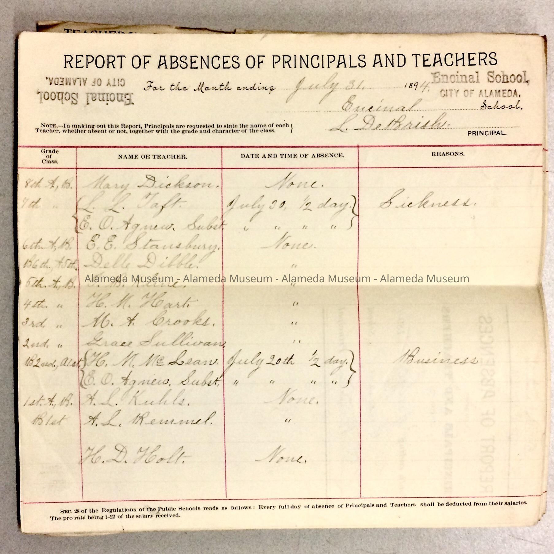 History of Object: Absence reports for Encinal (Mastick), Haight, Alameda High School, Evening School, Wilson (Lincoln), Everett, West End (Longfellow), and Porter.