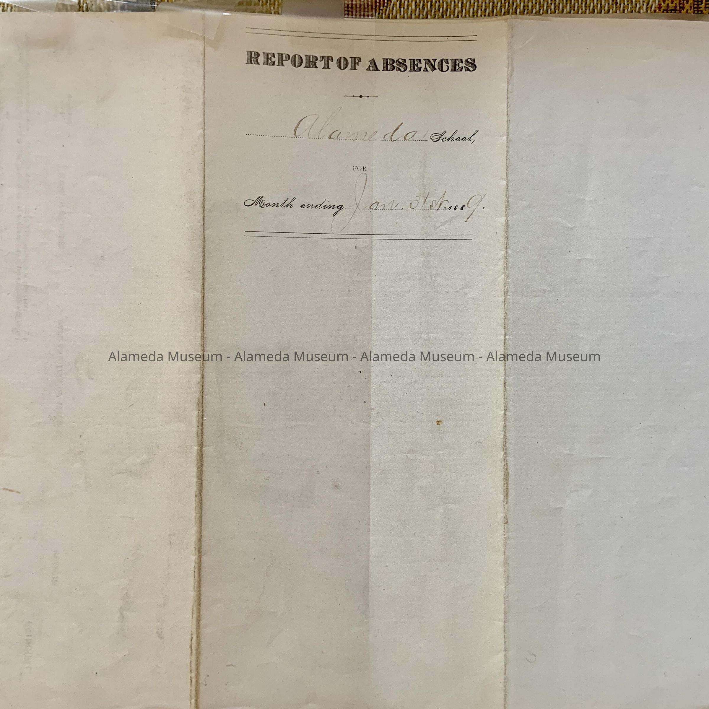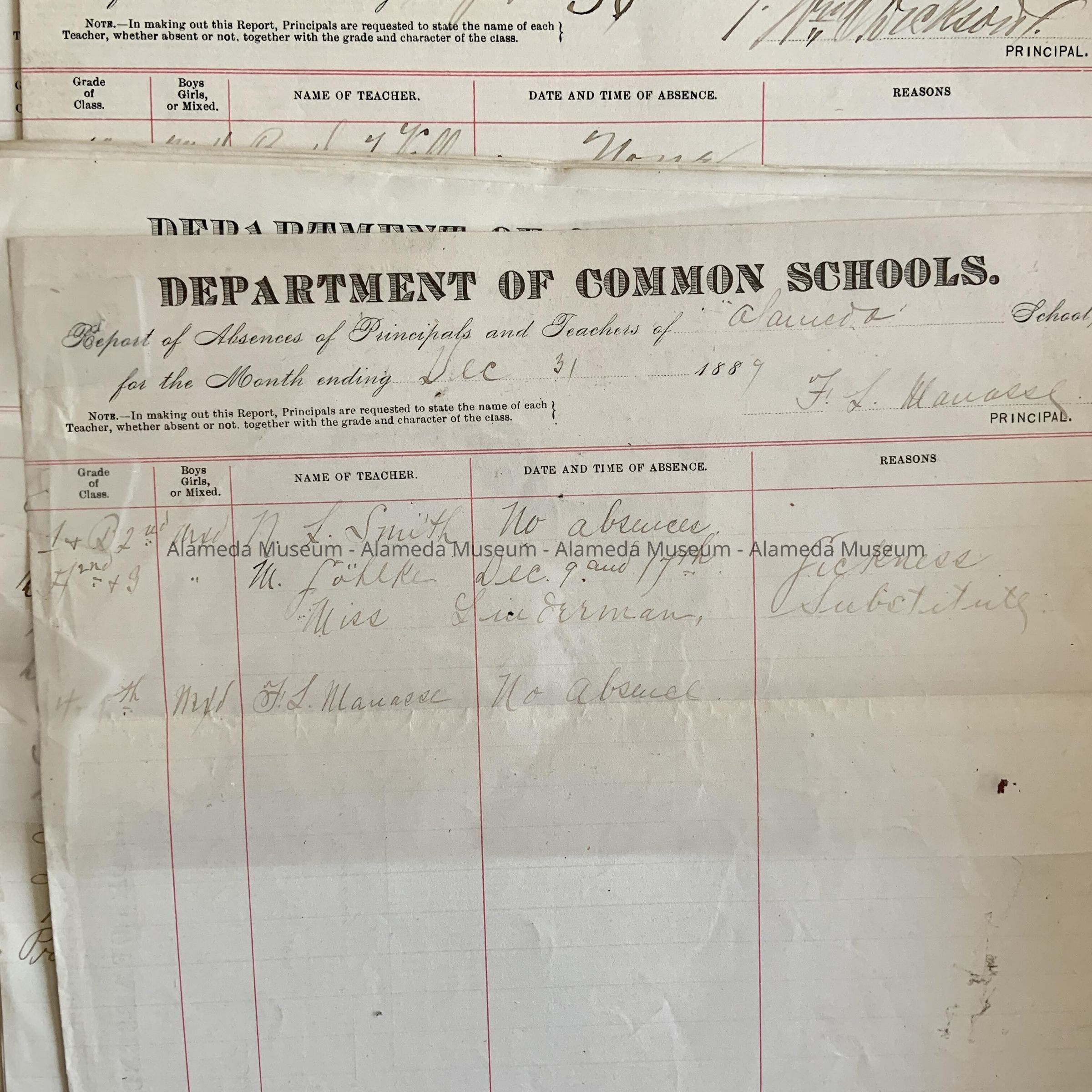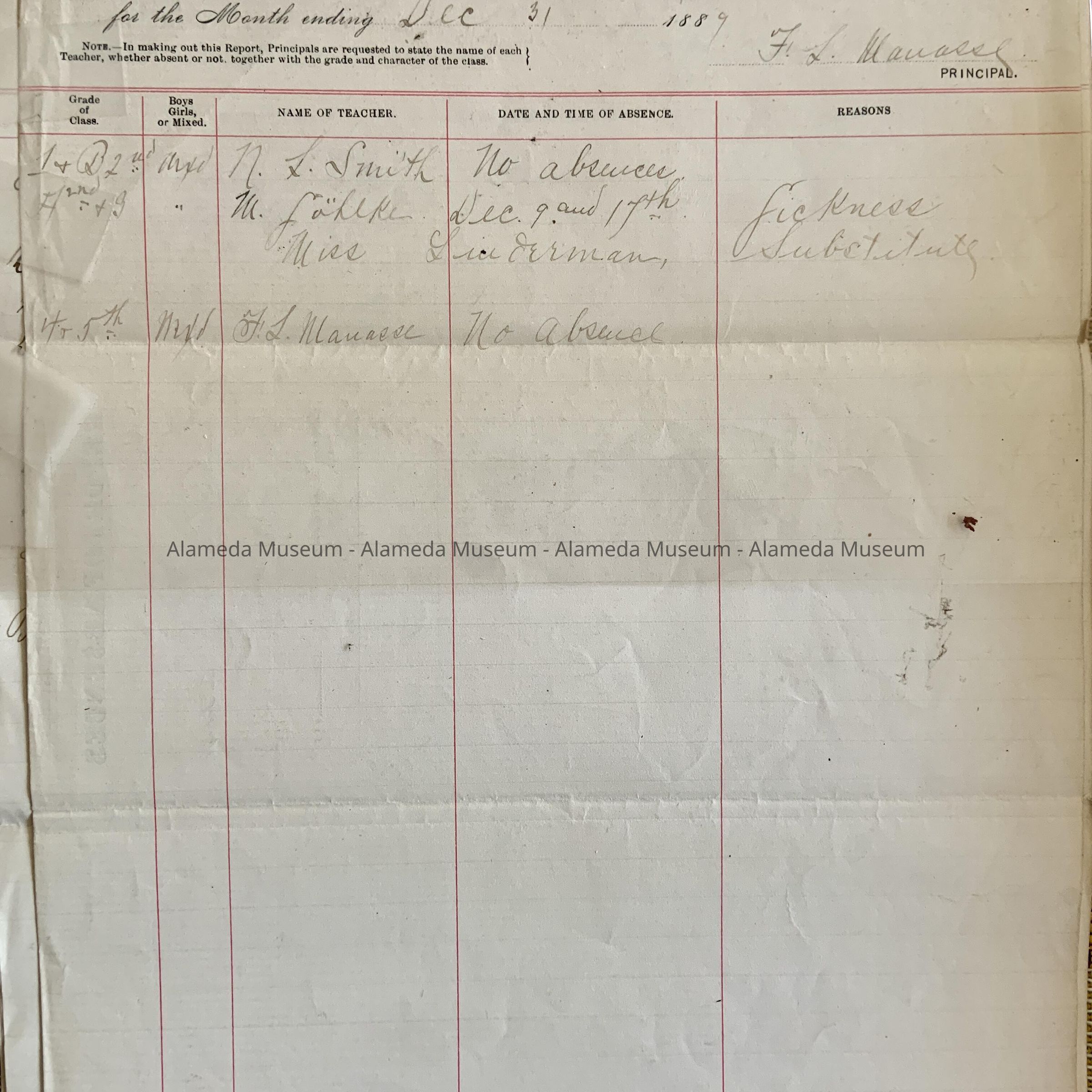 HISTORY OF OBJECT: A REPORT FORM CONCERNING ABSENCES OF PRINCIPALS AND TEACHERS IN ALAMEDA SCHOOLS FOR 1889.