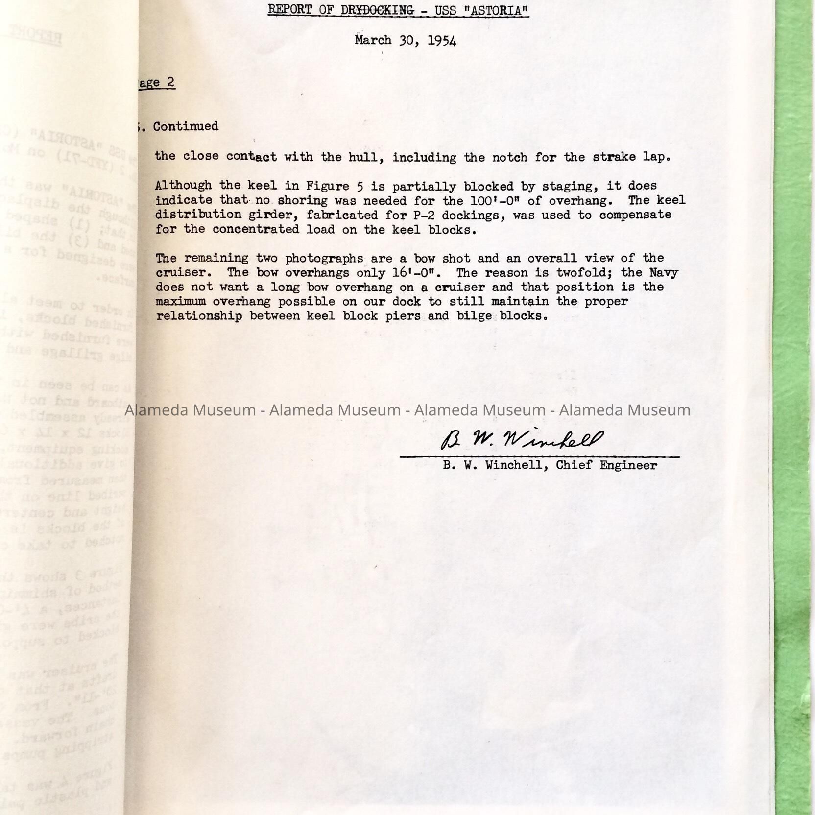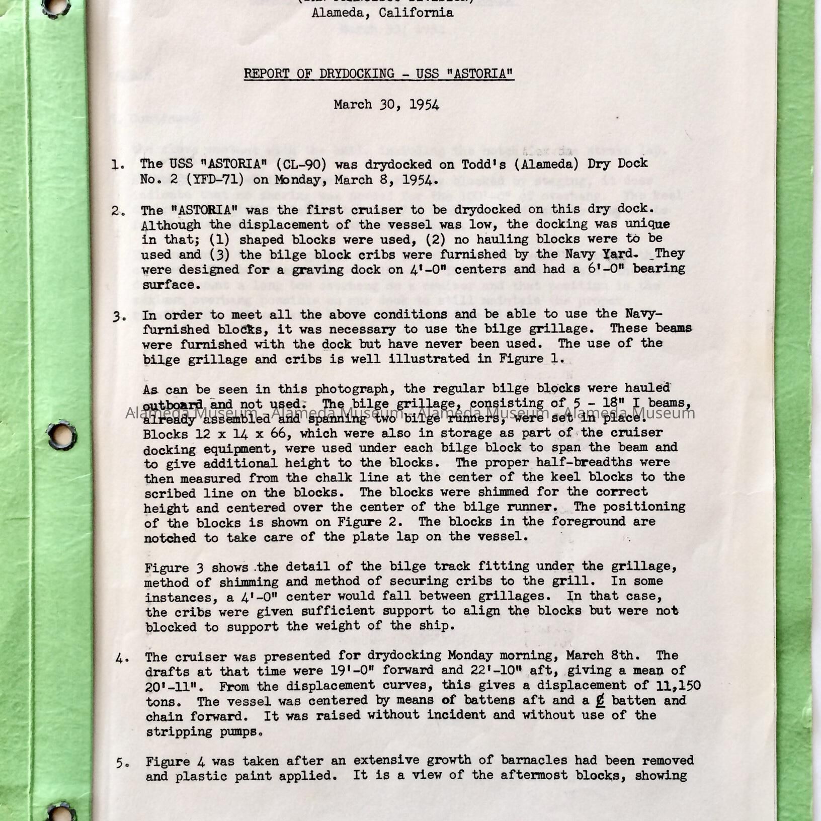 TYPEWRITTEN REPORT CONTAINED IN A LOOSELEAF, GREEN-COLORED HEAVY PAPER COVERLET. COVER HAS ATTACHED TYPEWRITTEN CAPTION STATING, "REPORT OF DRY DOCKING,' USS ASTORIA.'" MARCH 8, 1954.