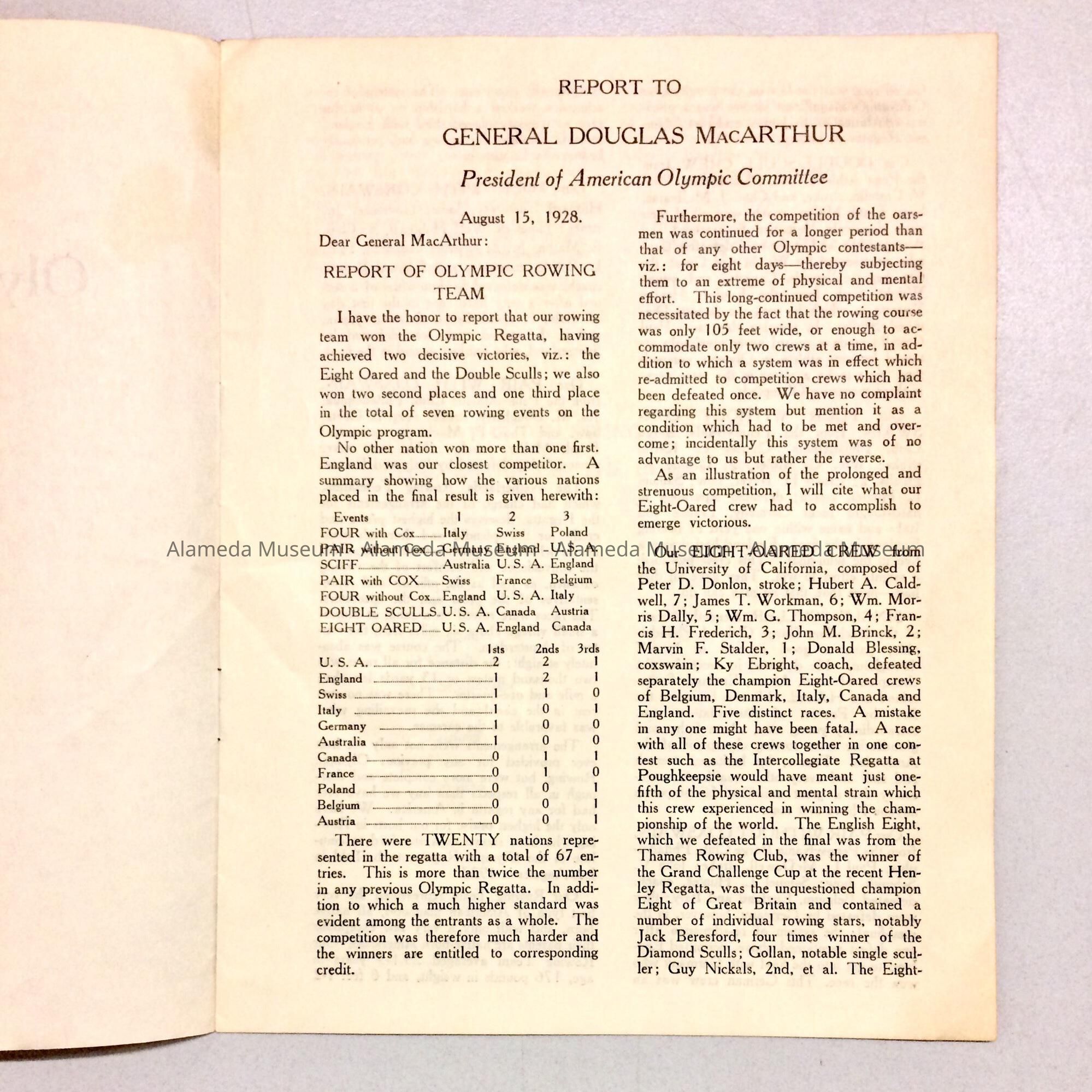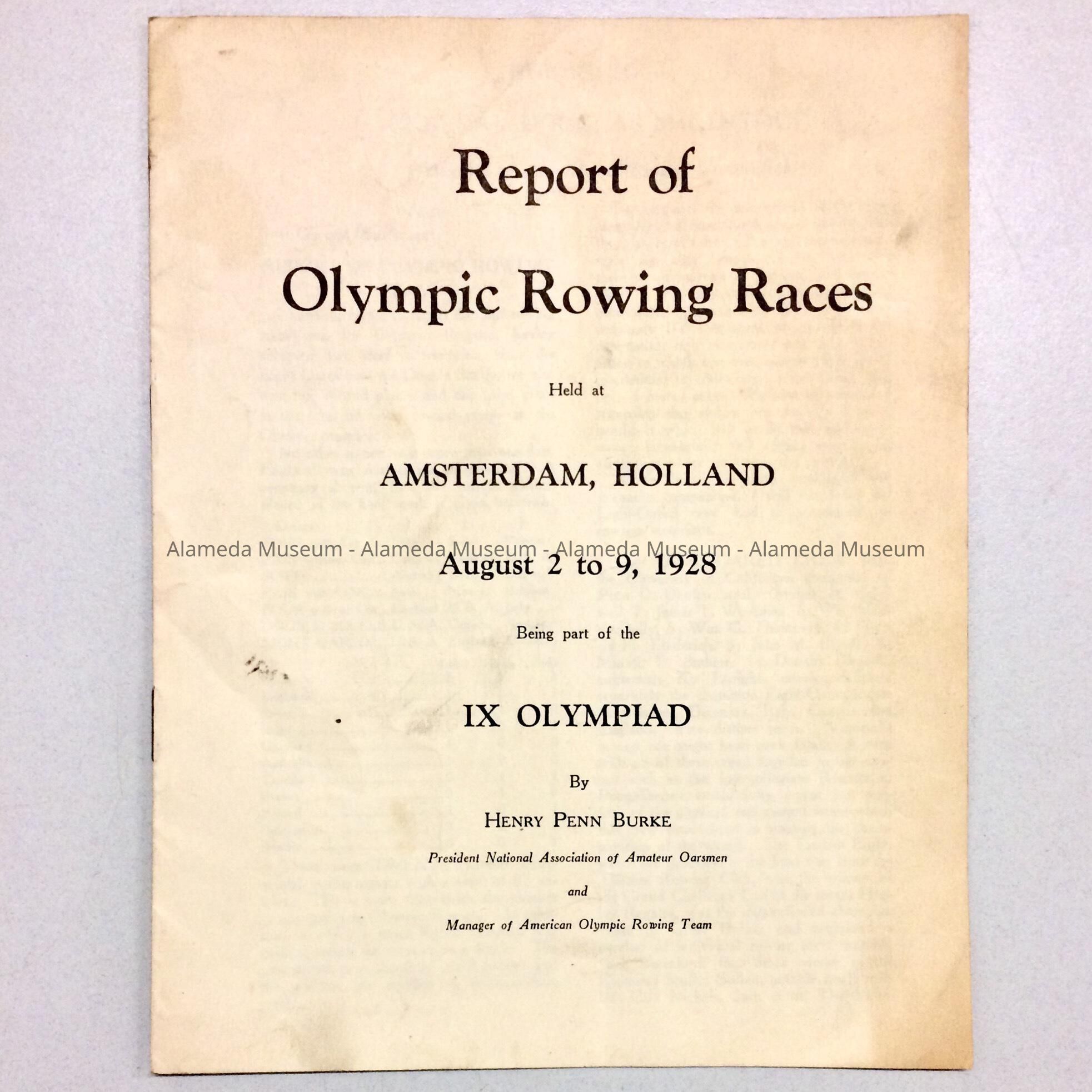 A REPORT OF OLYMPIC RACES HELD AT AMSTERDAM, HOLLAND, AUGUST 8 THRU 9, 1928. THE REPORT WAS PART OF THE COLLECTION OF THE ALAMEDA BOATING CLUB.