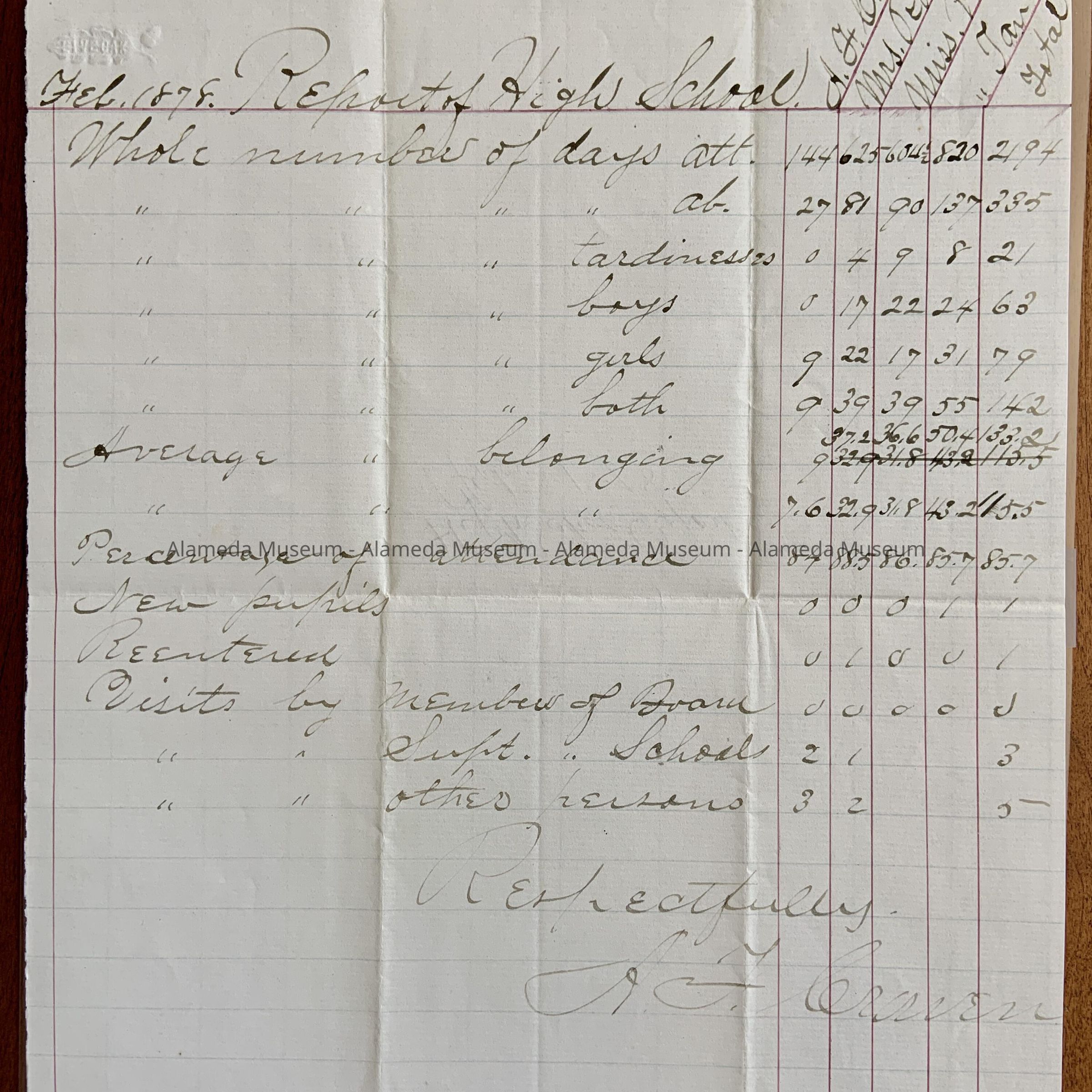 Report on attendance at Alameda High School, February 1878Entry/Object ID
