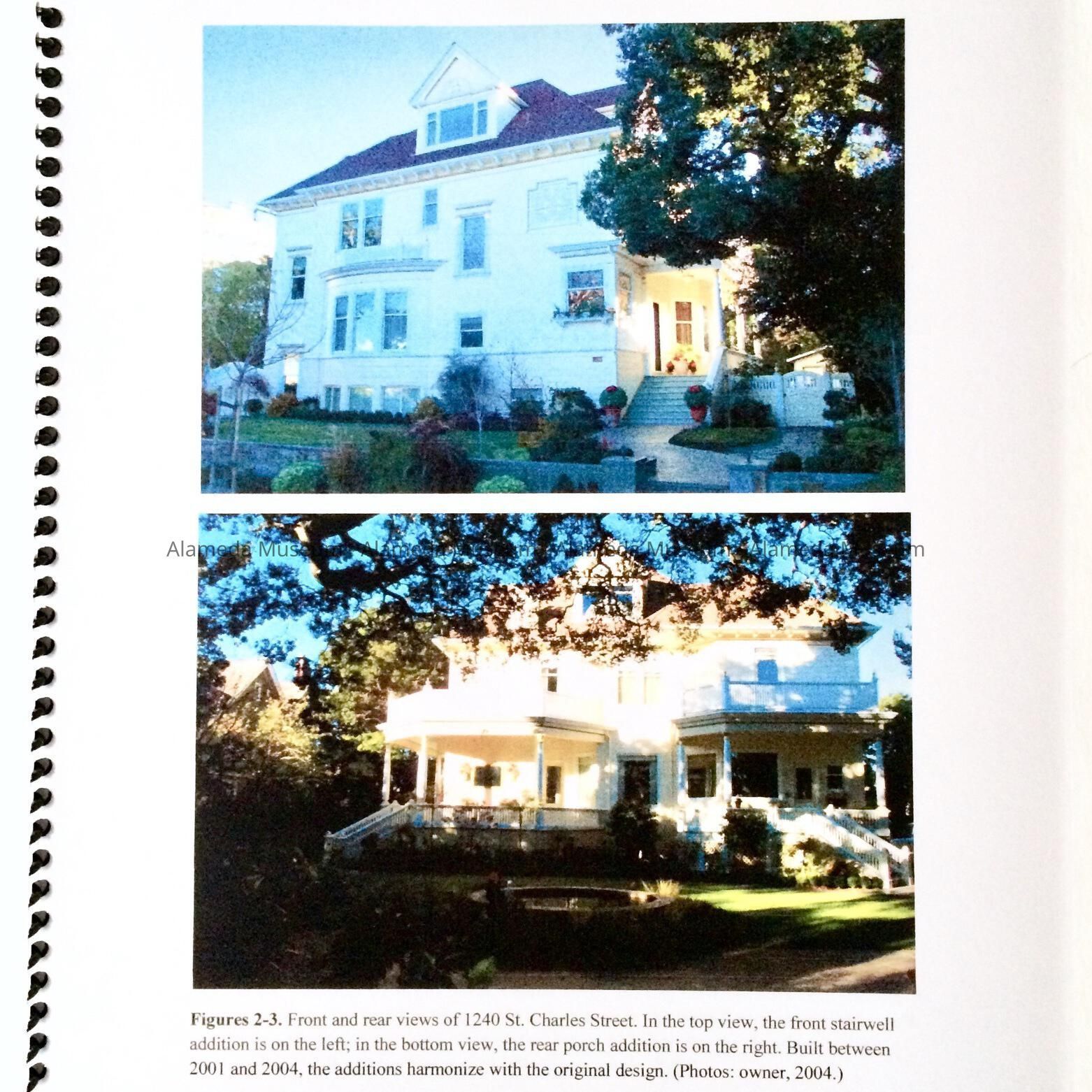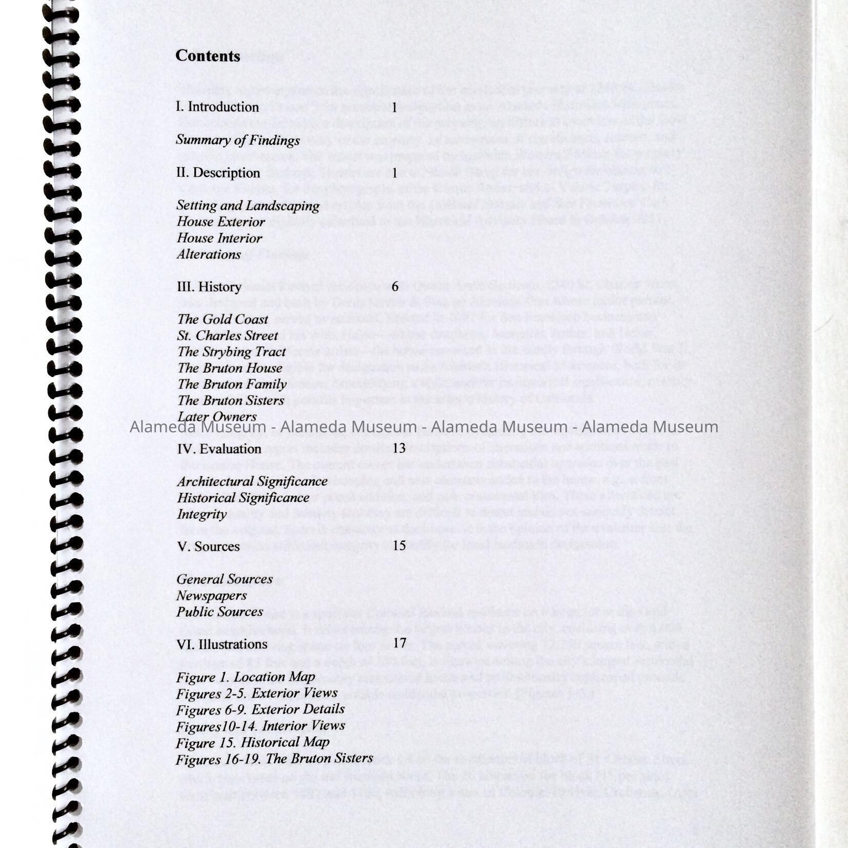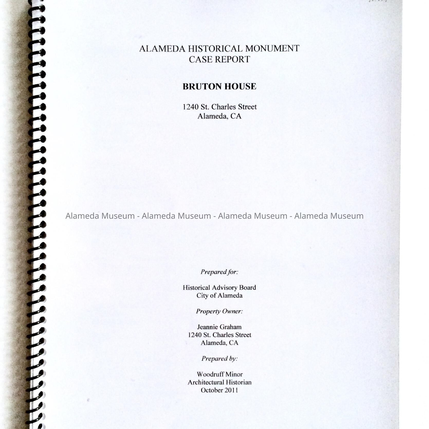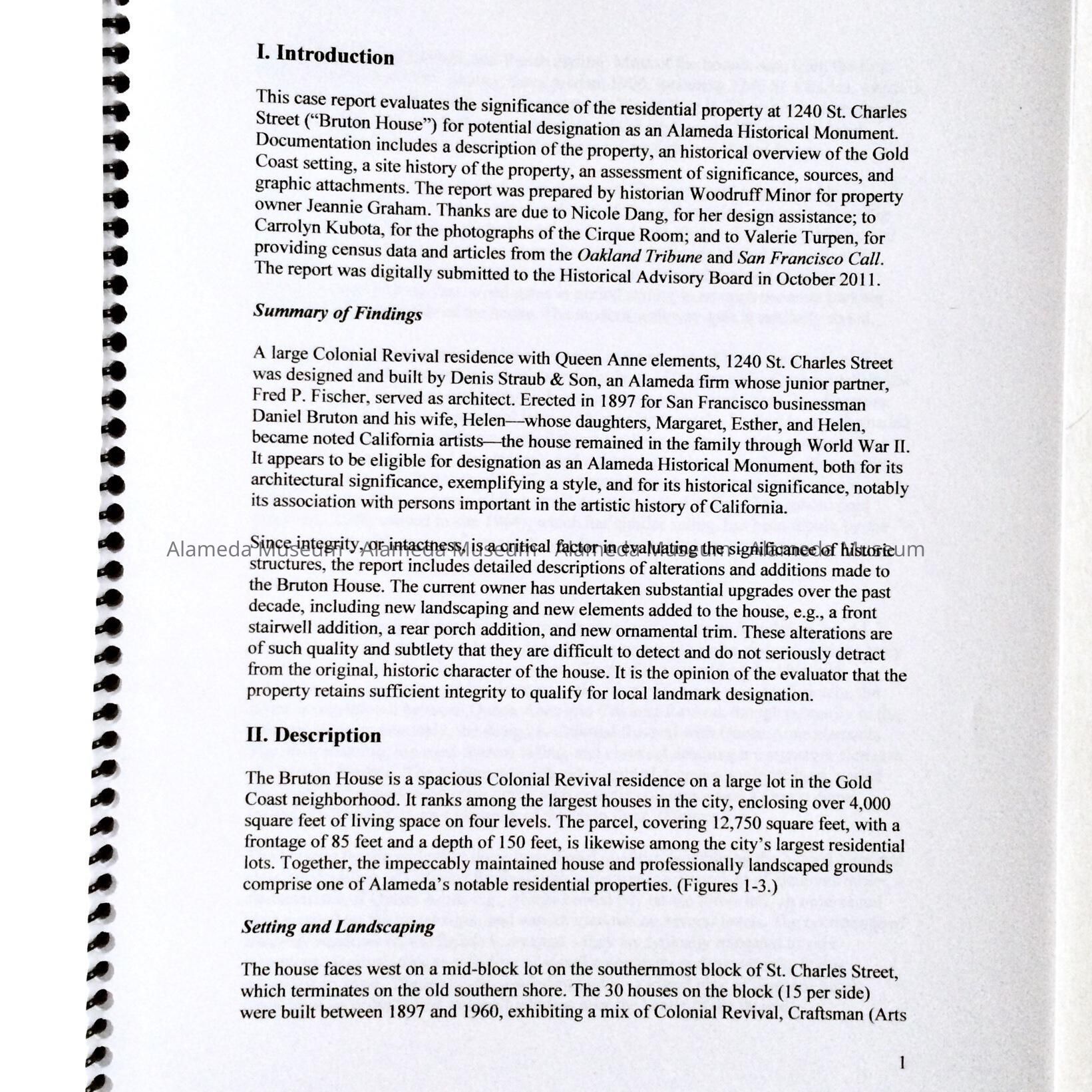 HISTORY OF OBJECT: A REPORT PREPARED BY THE HISTORIAN, WOODY MINOR OF THE BRUTON HOUSE, 1240 ST CHARLES ST., ALAMEDA. THE REPORT WAS CREATED FOR SOME MISSION TO THE ALAMEDA HISTORICAL ADVISORY BOARD FOR SEEKING MONUMENT STATUS. THE HOUSE IS A COLONIAL REVIVAL RESIDENCE AND WAS BUILT BY THE BUILDER, DENIS STRAUB AND SON, FOR D. BRUTON IN 1897. THE IMPORTANCE OF THE STRUCTURE LIES IN THE FACT THAT THREE BRUTON SISTERS' DAUGHTERS OF HELEN AND DANIEL, WERE NOTED CALIFORNIA ARTISTS.