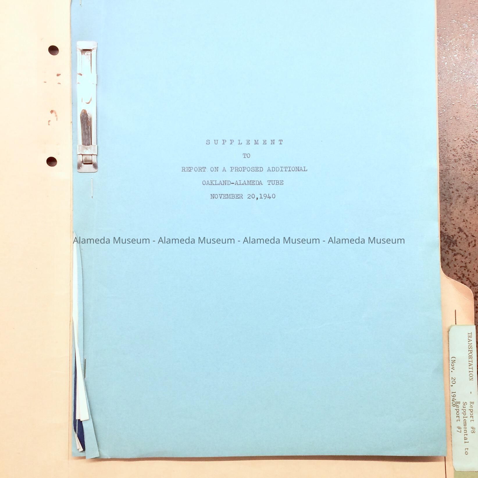 History of Object: Folder found in the attic of City Hall in the 1990s. The Report is titled Supplement to Report on a Proposed Additional Oakland-Alameda Tube, November 20, 1940, and was written by Wallace B. Boggs, Consulting Engineer, and John G. Marr, City Planning Engineer, Oakland. Report includes blueprint schematics of traffic flow in the Posey Tube, for 1939, 1940 and 1936-1939.