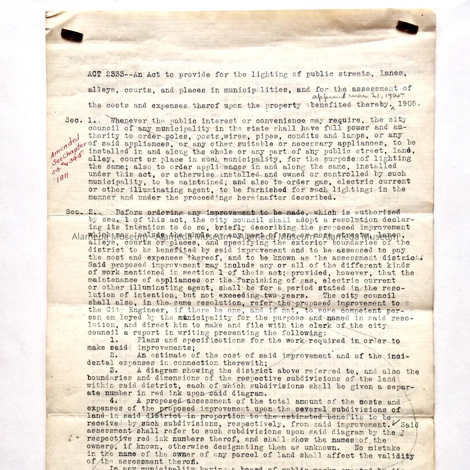 History: Report which is a proposal for regulations concerning public street lighting, City of Alameda dated 1905.