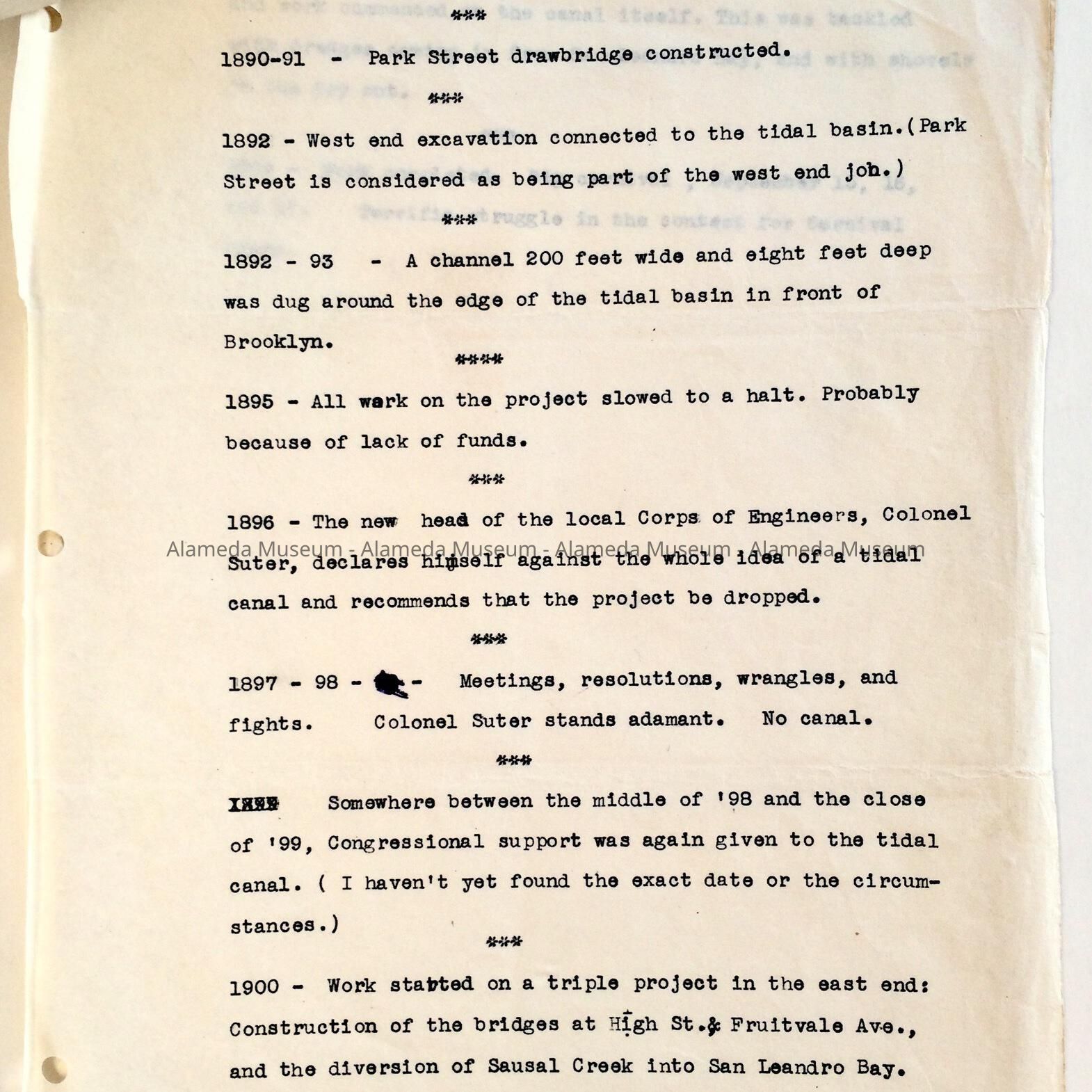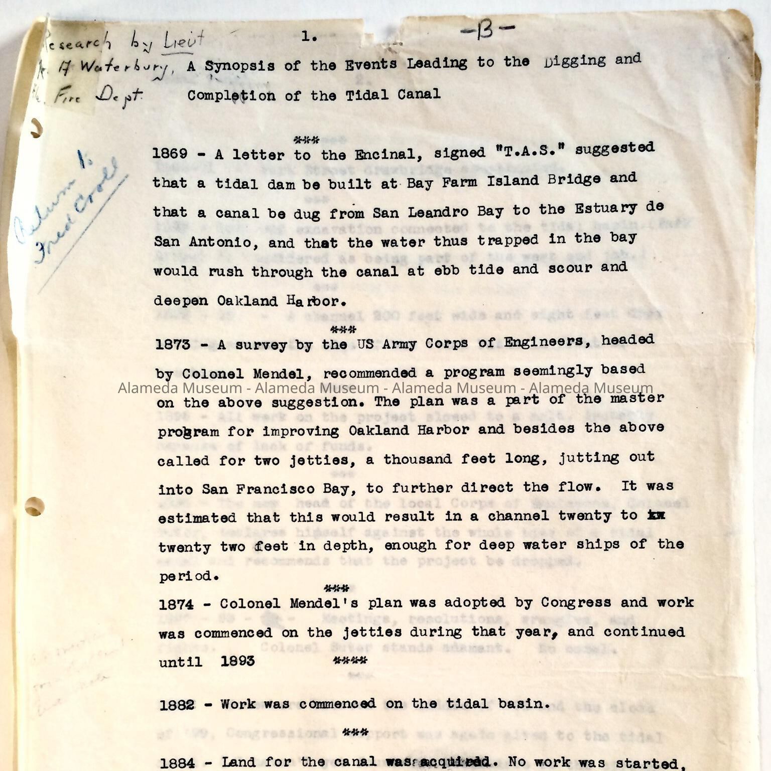 History: Historical report titled, "A Synopsis of the Events Leading to the Digging and Completion of the Tidal Canal 1869-1902". Report was researched by Archie Waterbury.