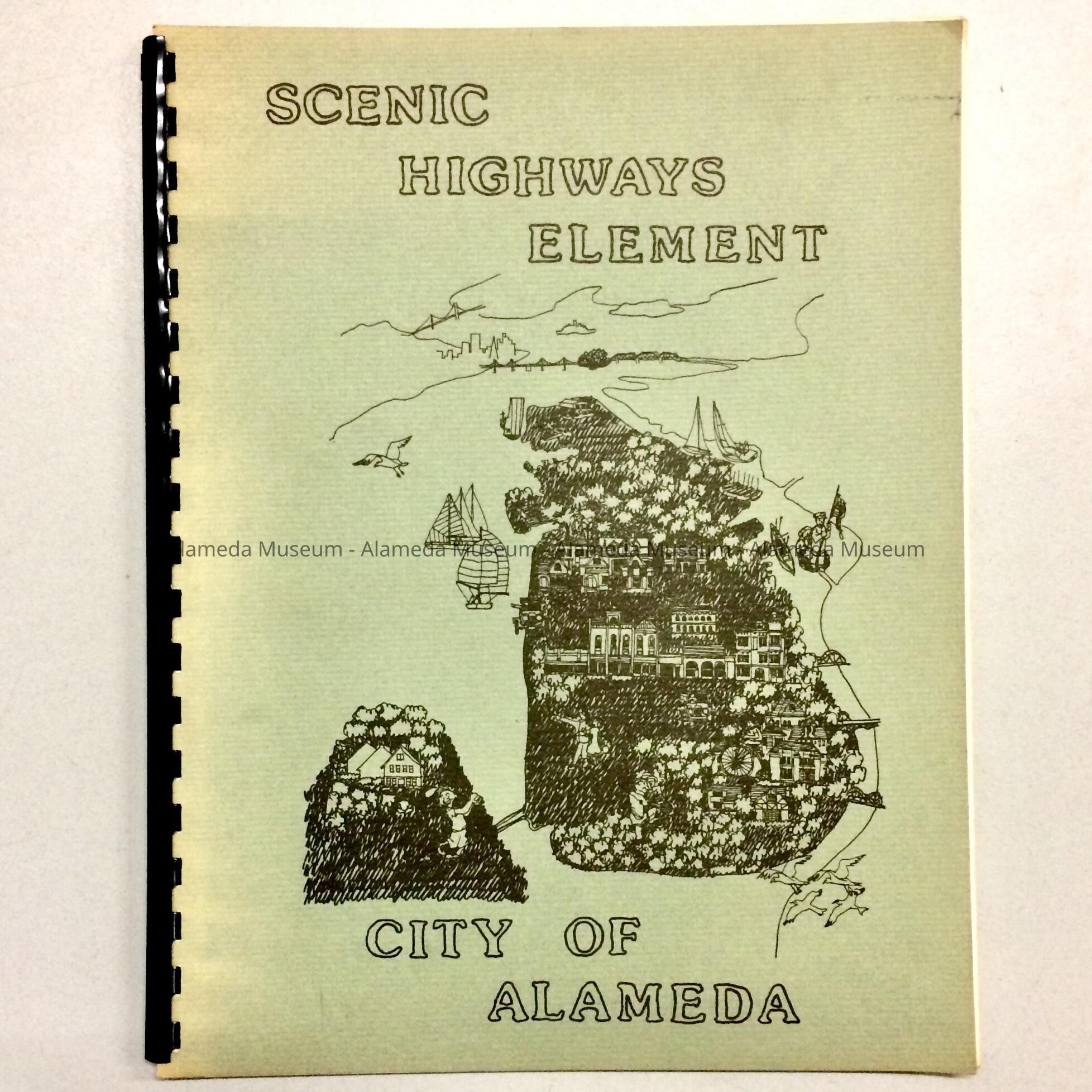SOFT-BOUND REPORT, WITH SPINE OF BLACK-COLORED SPIRAL PLASTIC. COVER DESIGN IN BROWN-COLORED TYPE ON A PALE GREEN-COLORED BACKGROUND. REPORT FEATURES A CARICATURE DRAWING OF THE ISLAND OF ALAMEDA. BOLD PRINTED CAPTION, "SCENIC HIGHWAYS ELEMENT, CITY OF ALAMEDA.".