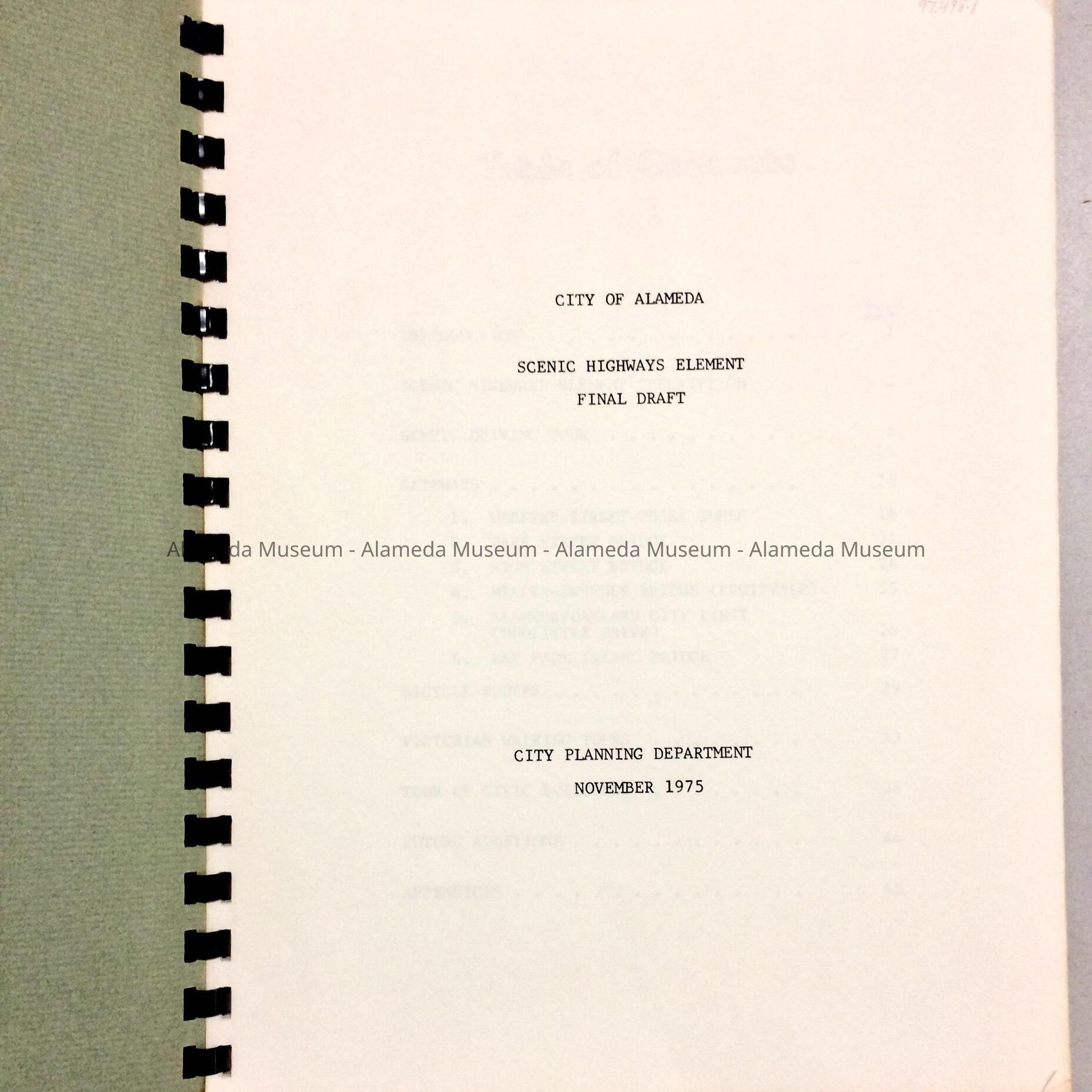 REPORT ENTITLED, "CITY OF ALAMEDA SCENIC HIGHWAYS ELEMENT." FINAL DRAFT PRODUCED BY THE ALAMEDA CITY PLANNING DEPARTMENT, NOVEMBER 1.975. DESCRIBES BRIDGES AND ENTRIES INTO THE CITY OF ALAMEDA. IT ALSO INCLUDES A TOUR OF THE CIVIC CENTER, AS WELL AS WALKING TOURS OF VICTORIAN NEIGHBORHOODS.