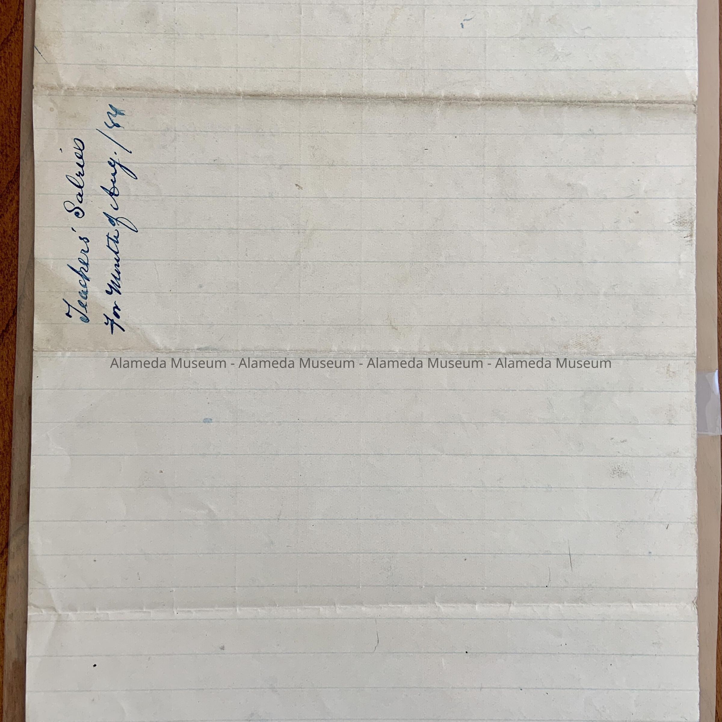 A HANDWRITTEN FORM ON LINED PAPER. BOLD-PRINTED CAPTION STATES, "TEACHERS' SALARIES FOR AUGUST 1884." WRITTEN IN BLUE-COLORED INK ON LINED PAPER.