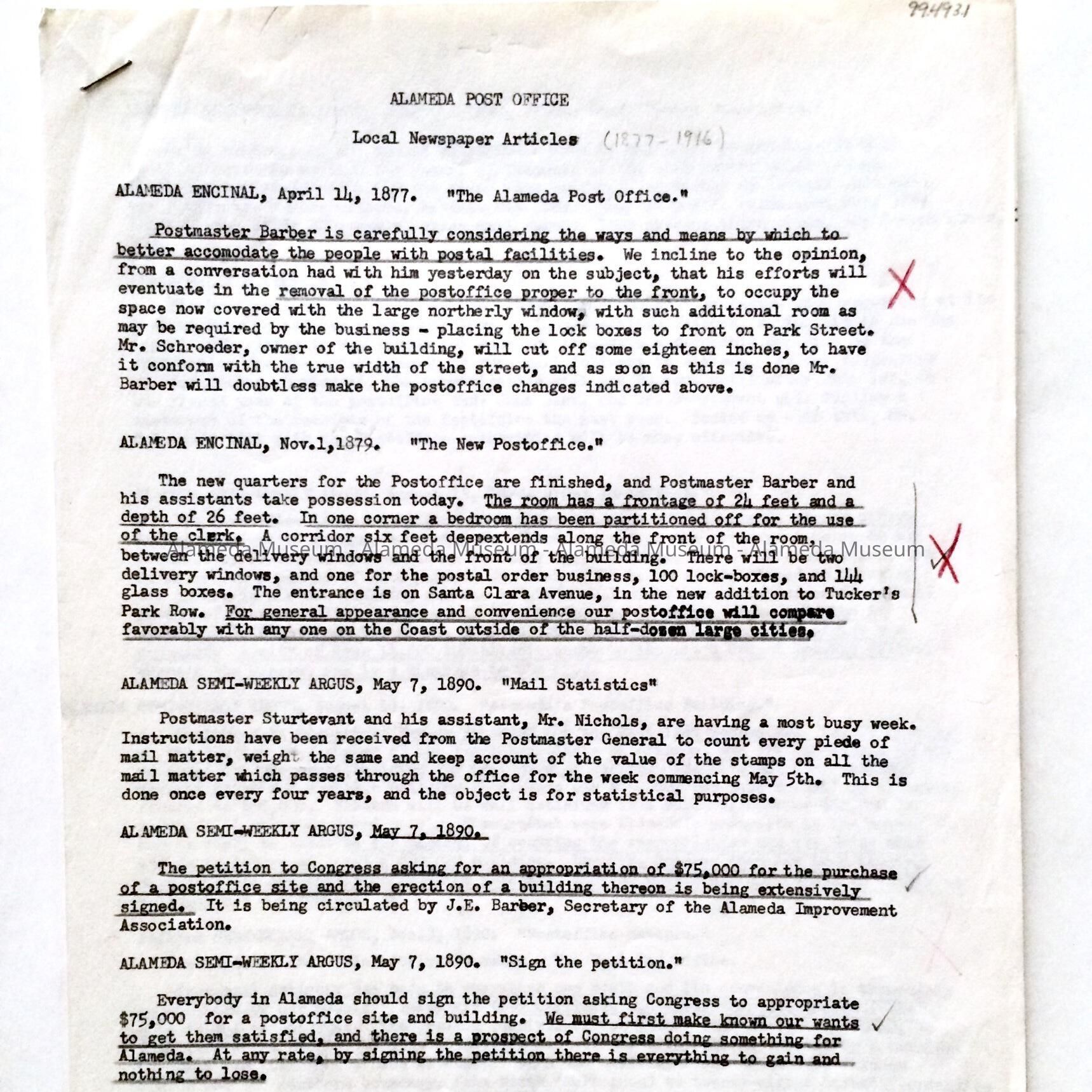 Report with newspaper excerpts about the Alameda Post Office, prior 1999Entry/Object ID
