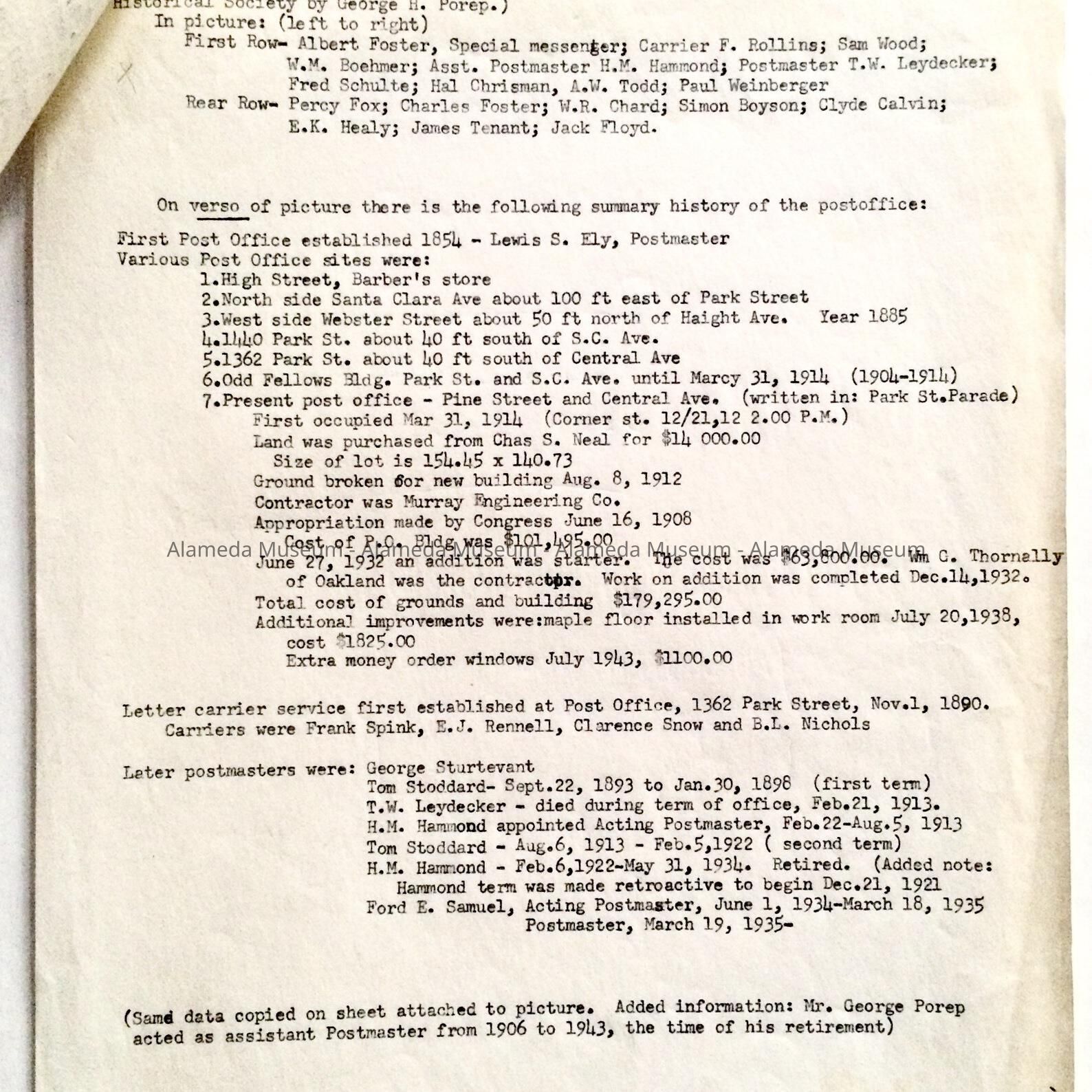 Three page, typewritten report. Cover page has bold printed caption "Alameda Post Office"
