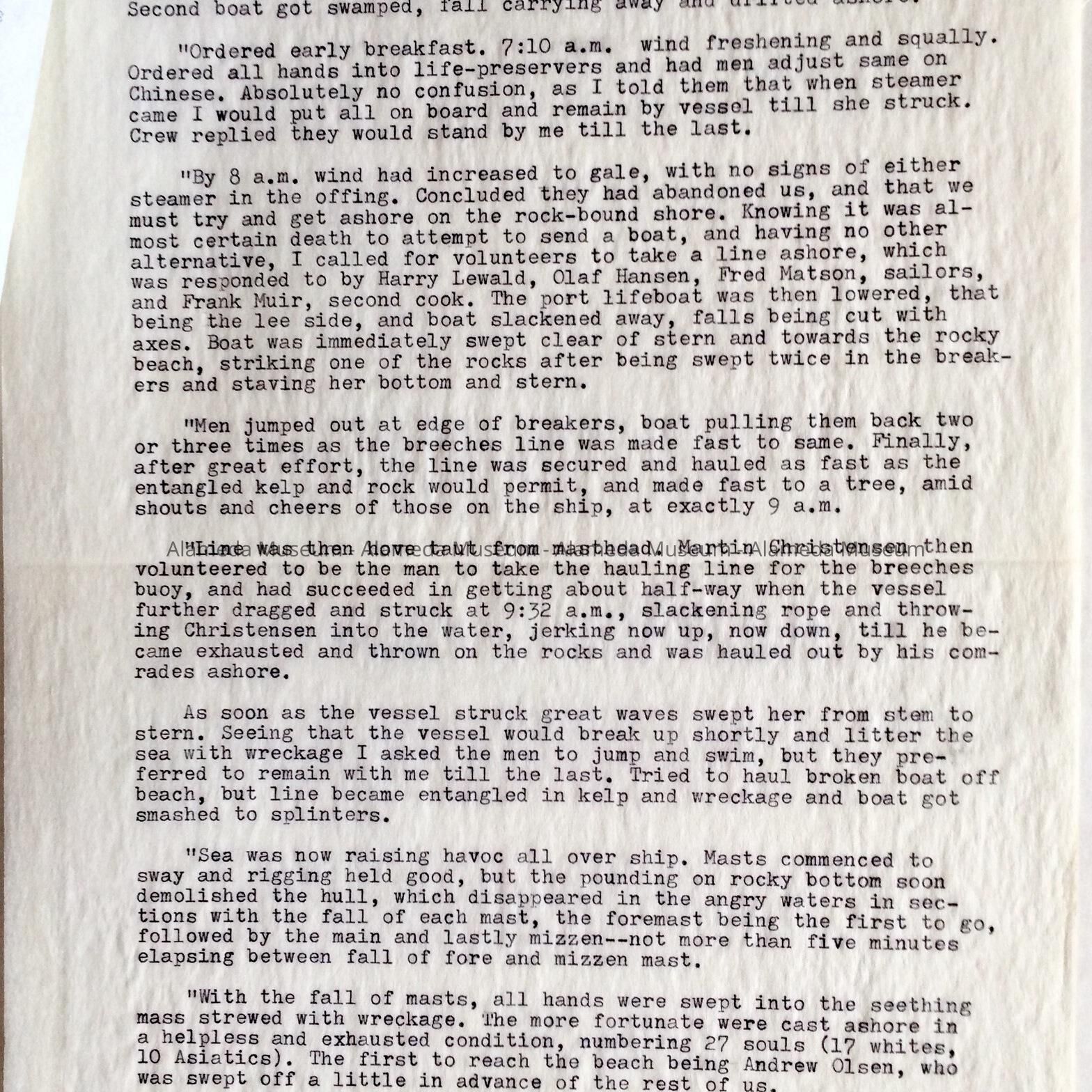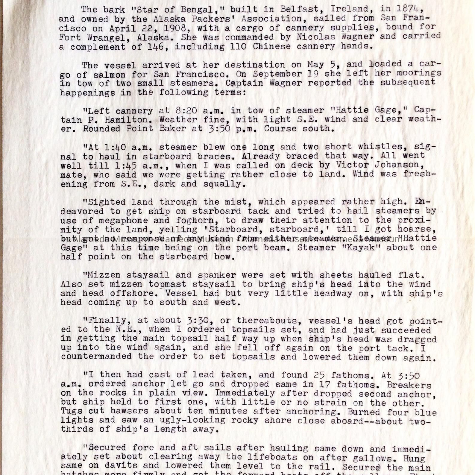 Three (3) page original typewritten report accompanied by two (2) photocopies. Cover page has bold printed caption "Wreck of the Bark Star of Bengal".