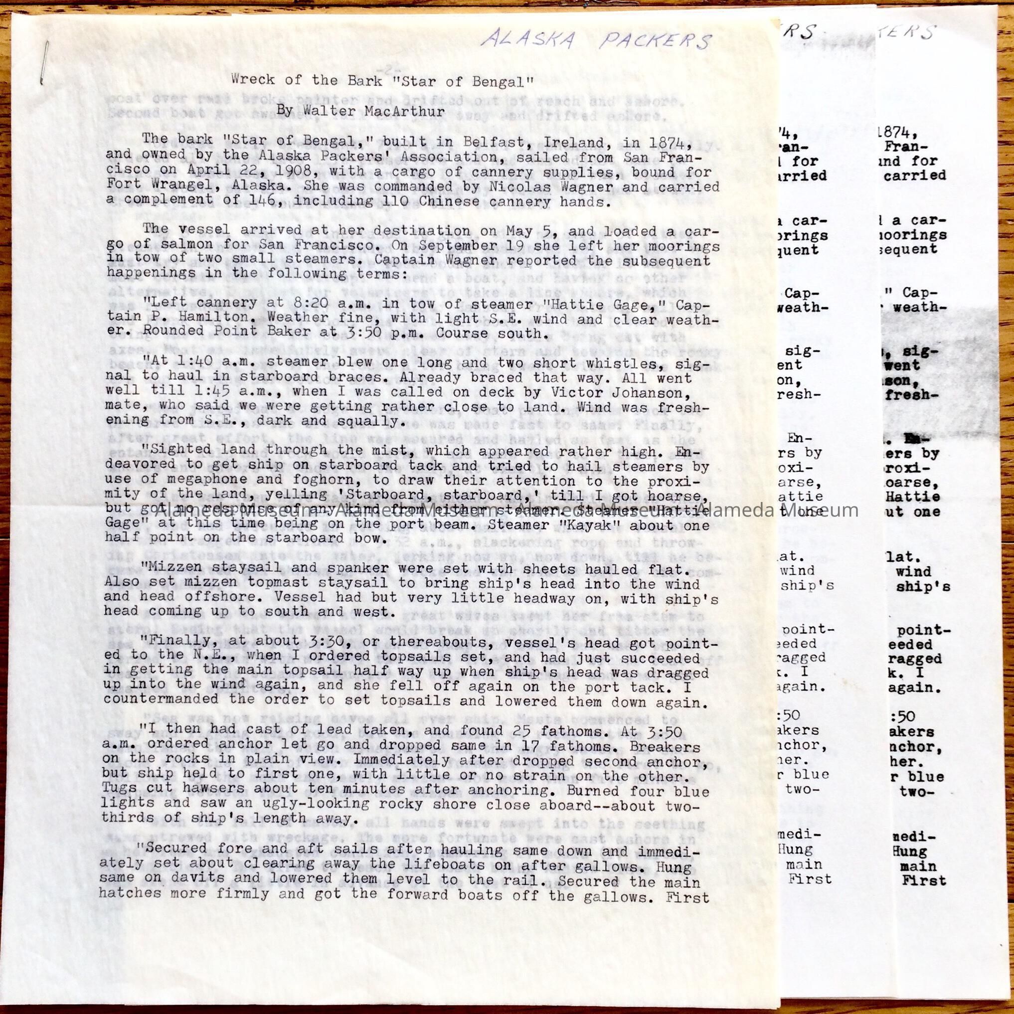 Report 'Wreck of the Bark Star of Bengal' by Walter MacArthur, prior to 1999Entry/Object ID