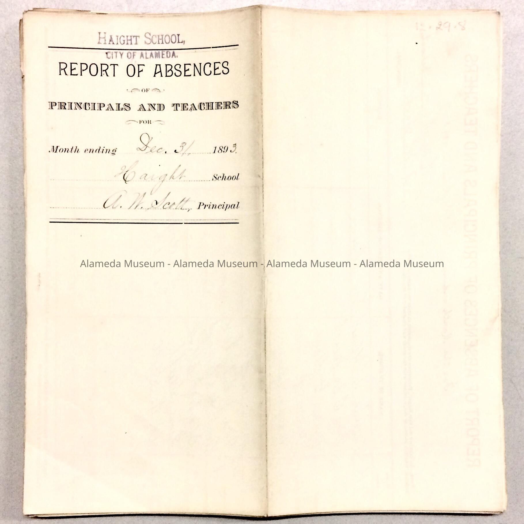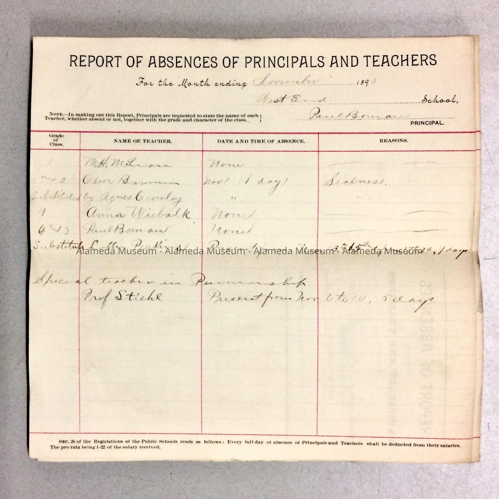 History of Object: Absence reports for Encinal (Mastick), Haight, Alameda High School, Evening School, Wilson (Lincoln), Everett, West End (Longfellow) and Porter.