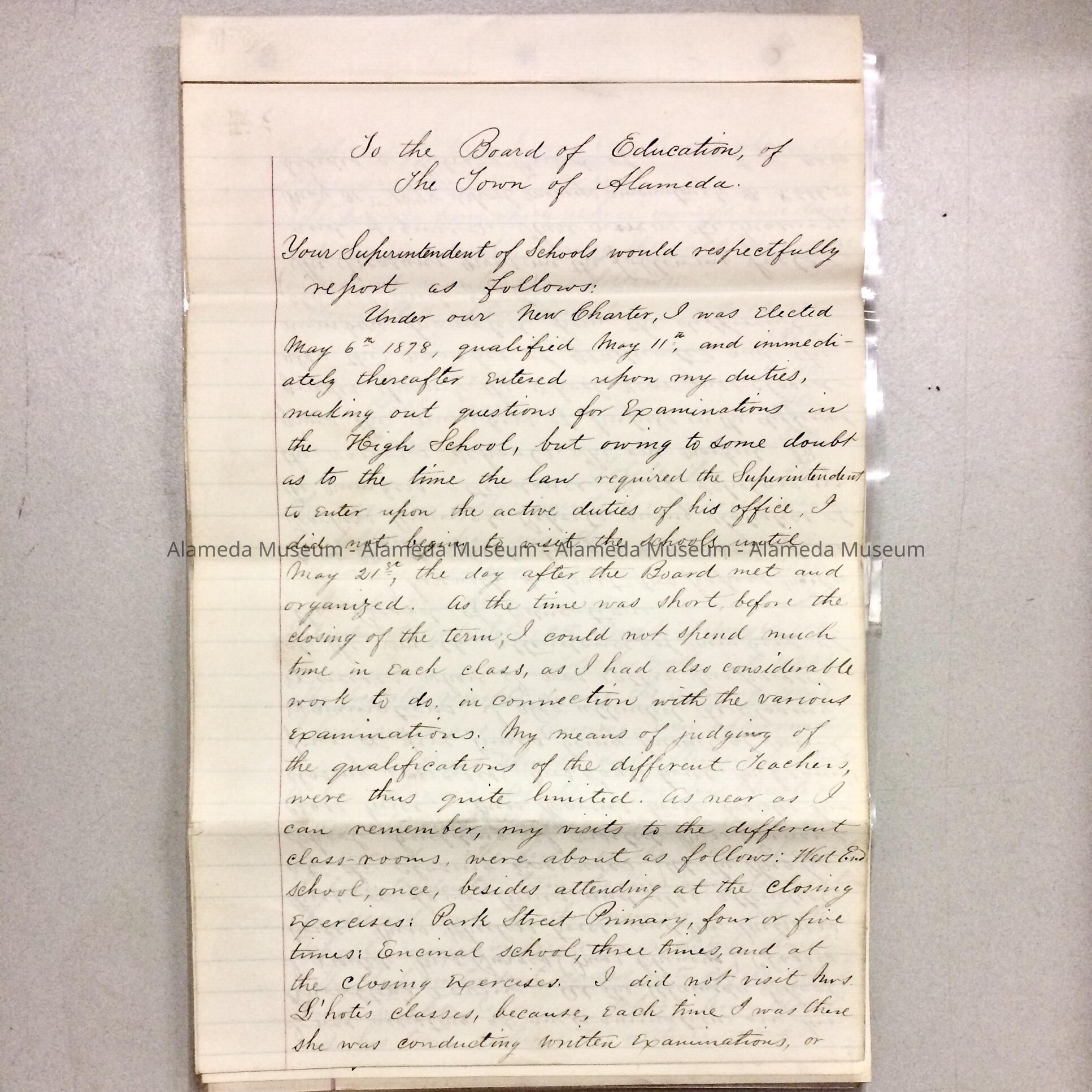 History of Object: Reports addressed to the Board of Education on the operation and other pertinent information relating to the Alameda Schools, submitted by George R. Bissel, Superintendent.