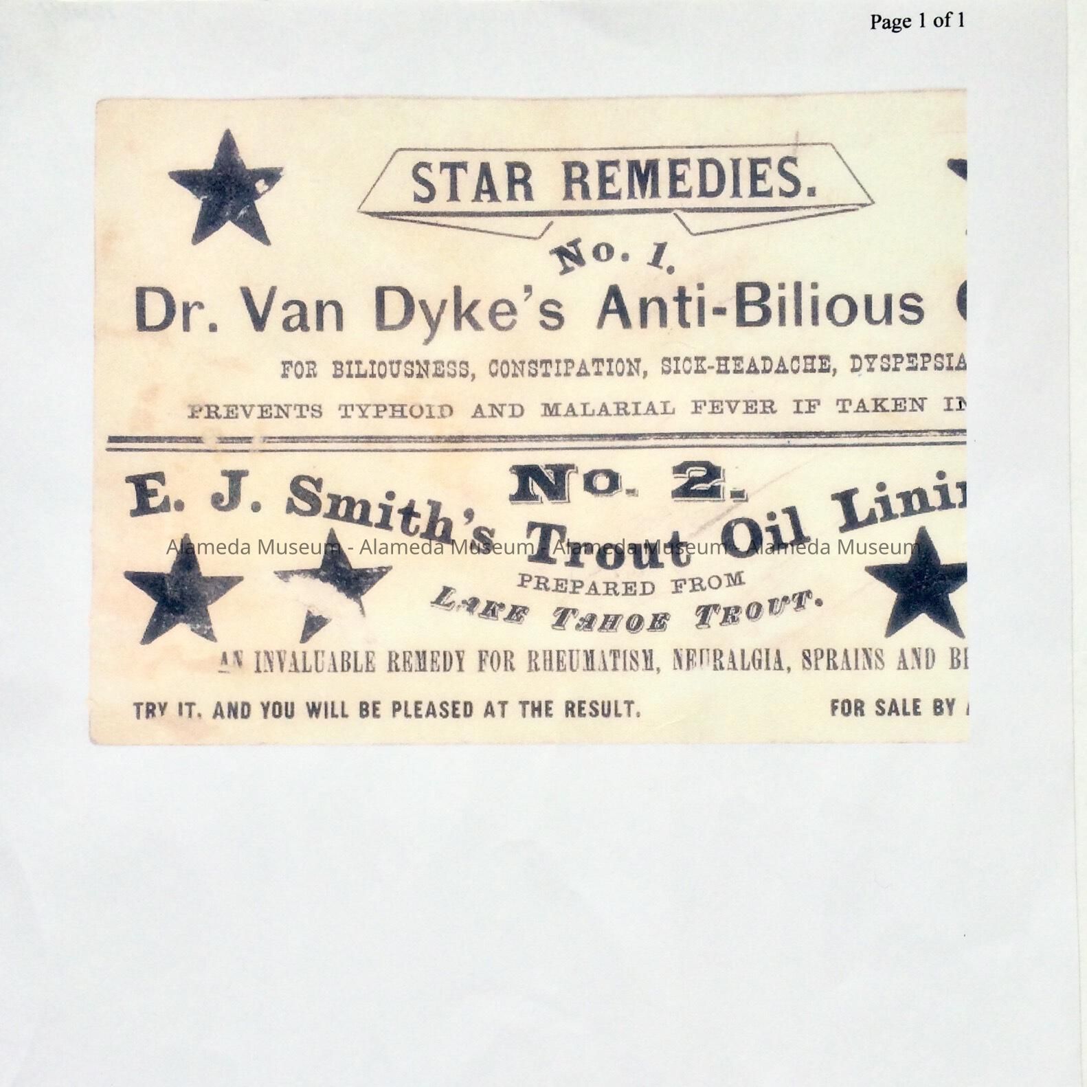 HISTORY OF OBJECT: A REPRODUCED ADVERTISEMENT OF AN UNKNOWN DATE. MEDICAL PRODUCTS WERE OFFERED AT THE PHARMACY. E.B. KEENE WAS THE DRUGGIST ON PARK STREET, ALAMEDA.