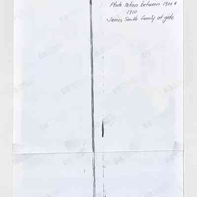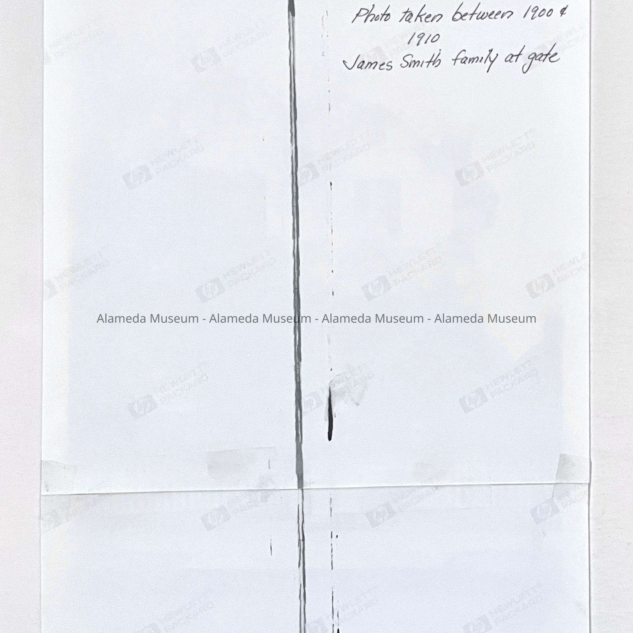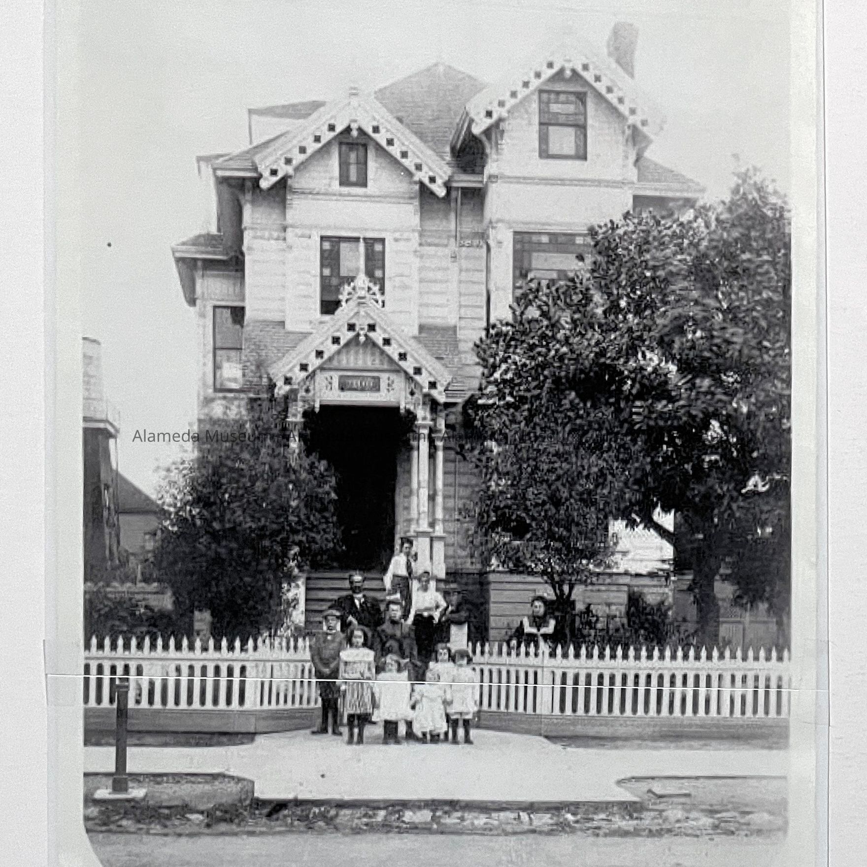 A PHOTOGRAPH OF THE EXTERIOR OF 2109 SANTA CLARA AVENUE, ALAMEDA, TAKEN BETWEEN 1900 AND 1910. THE JAMES SMITH FAMILY IS SHOWN POSED AT THE ENTRY GATE OF THE PROPERTY. DONOR'S HISTORY IS QUOTED: "MR AND MRS JAMES SMITH WERE THE DONOR'S GRANDPARENTS. THE WOMAN PICTURED ON THE STEPS AT THE REAR OF THE GROUP IS THE OLDEST OF THE SMITH CHILDREN. HER NAME BEING MARY A SMITH, AND THE DONOR'S MOTHER. THE DONOR RESIDED AT THE HOUSE WITH HIS PARENTS, MARY A AND PAUL S WEINBERGER AND FAMILY, FROM 1930 TO 1959. JAMES W SMITH WAS THE DESIGNER AND BUILDER OF 2109 SANTA CLARA AVENUE, NO LONGER STANDING. HE DESIGNED ANOTHER HOUSE AT 1915 MINTURN STREET, WHICH IN 2002 IS STILL STANDING."