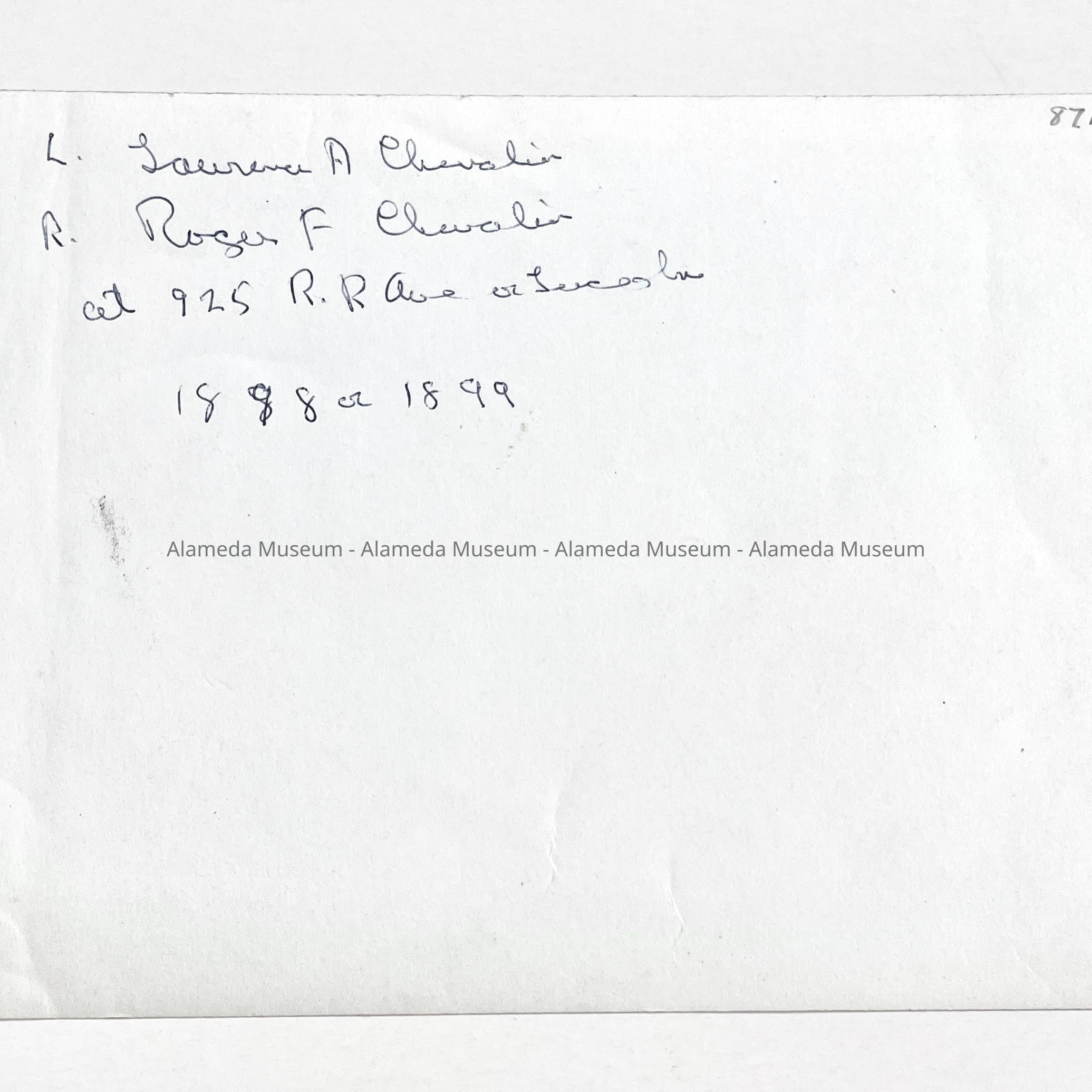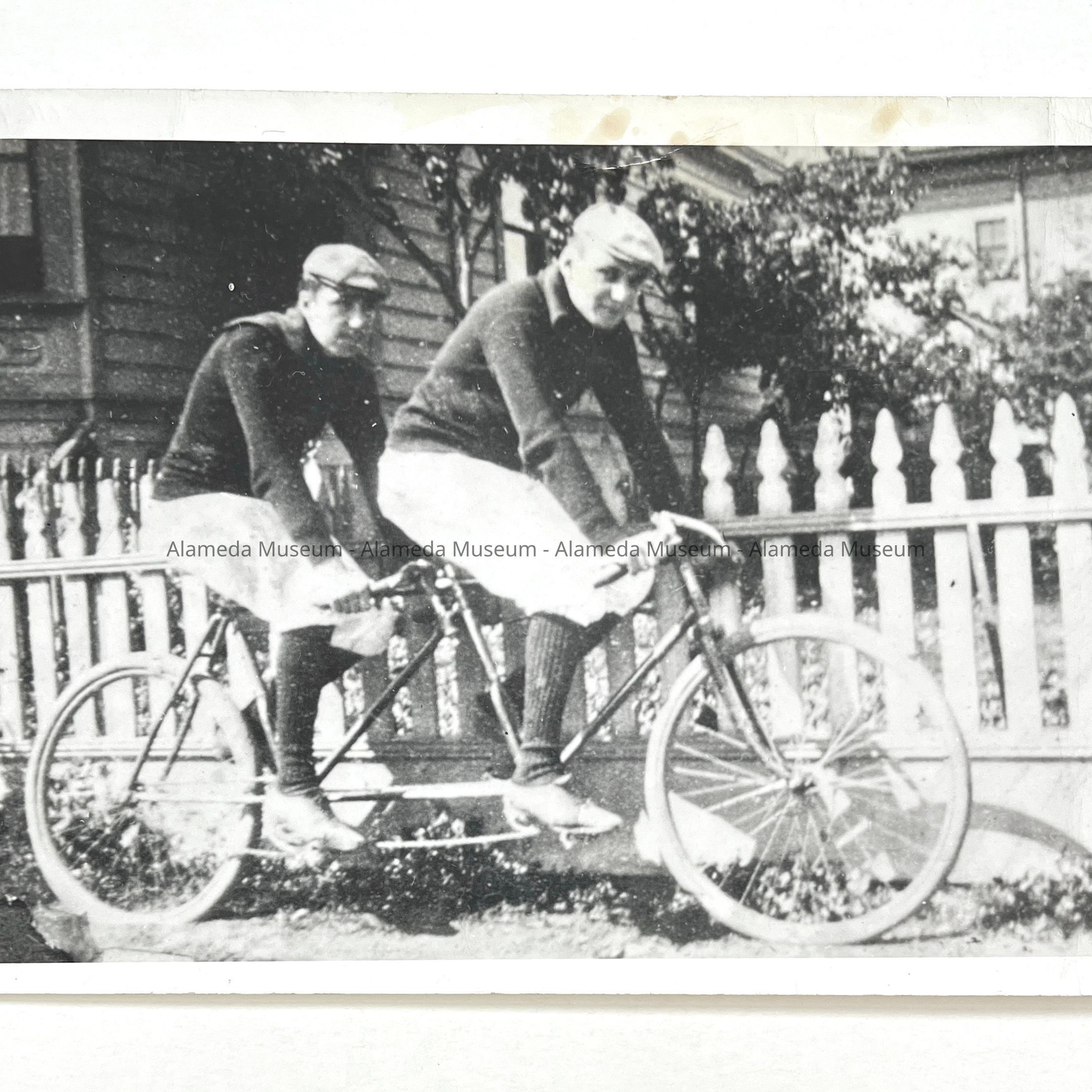 History of Object: Reproduced photo depicting the brothers, Lawrence A. & Roger F. Chevalier posed on a two-seat bicycle in front of 925 Lincoln Avenue, Alameda.