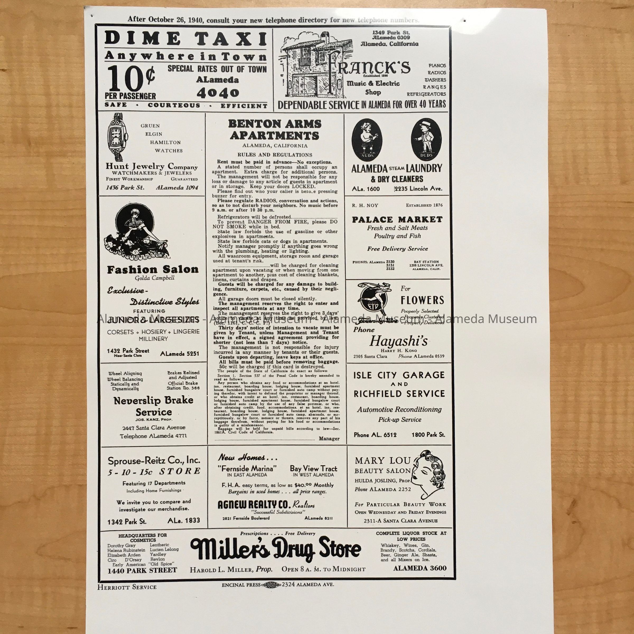 Description: A glossy reproduction page of an advertisement page, centrally headlined ‘Benton Arms Apartments’. Marked at the bottom ‘Herriott Service’ and ‘Encinal Press 2324 Alameda Ave’.