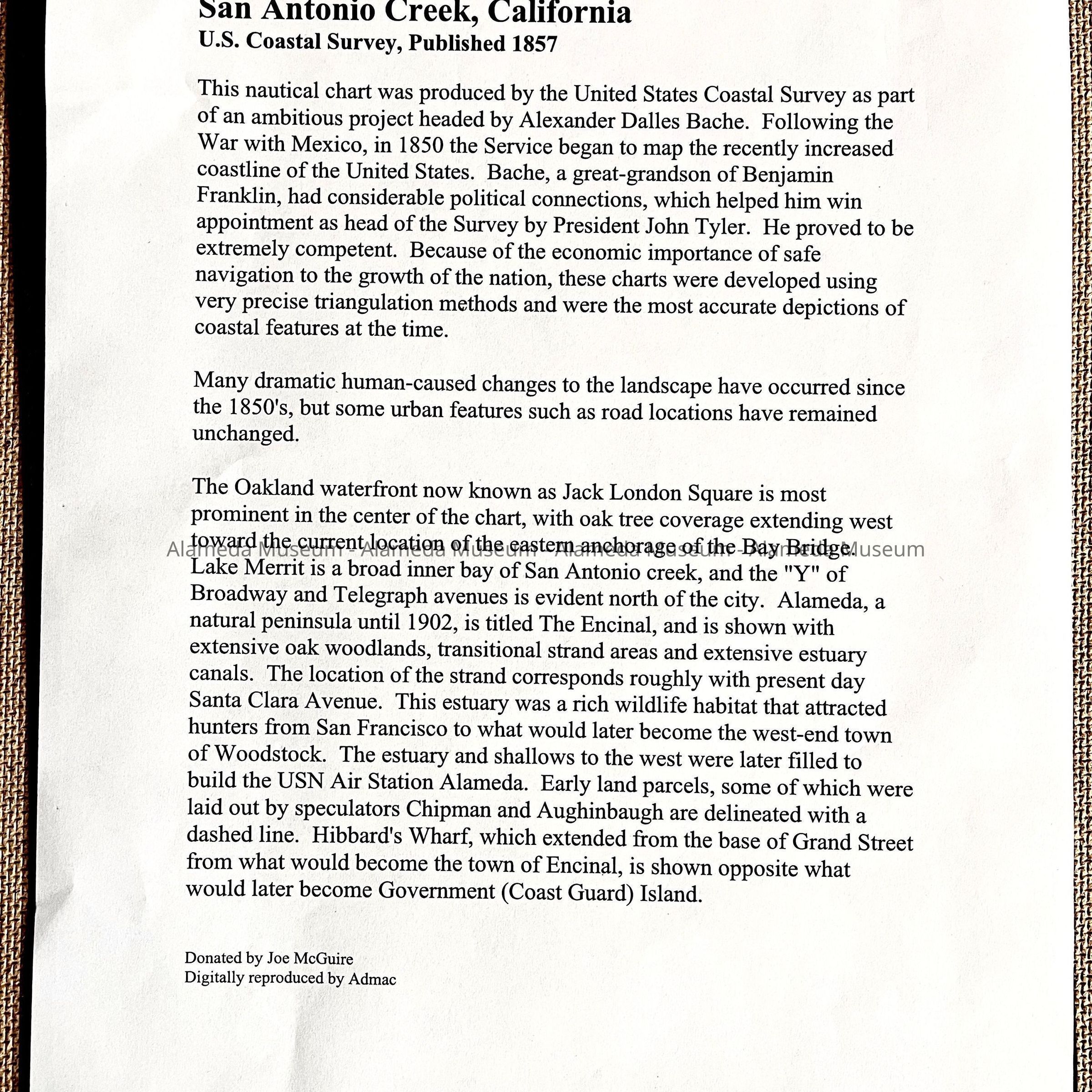 AN EARLY MAP, DEPICTING SAN ANTONIO CREEK, CALIFORNIA. MAP IS A US COASTAL SURVEY, PUBLISHED IN 1857. INFORMATION COPIED BY THE DONOR ACCOMPANYING THIS CARD.