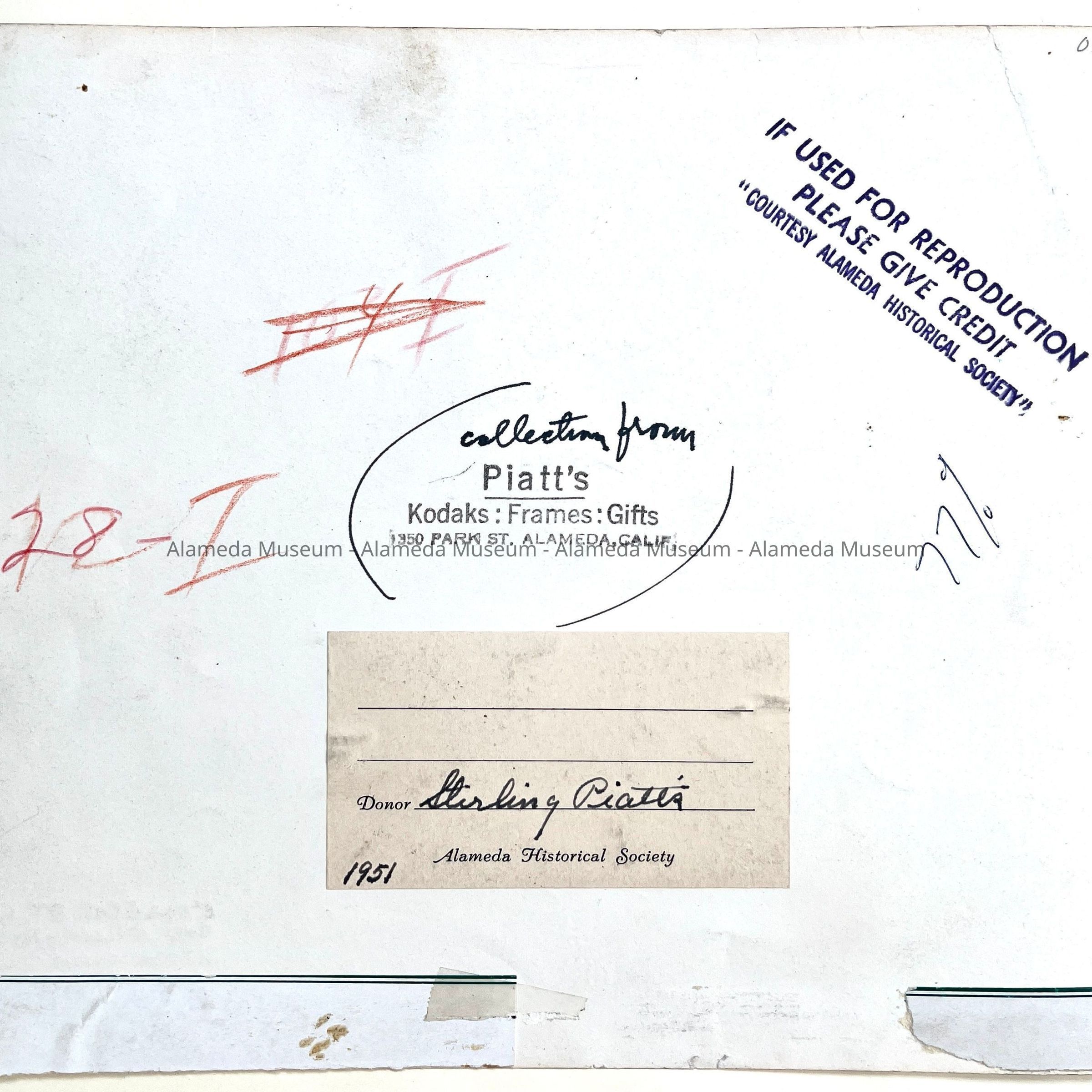 Description: Black and white glossy photograph, signed on reverse by Piatt's, 1350 Park Street.
