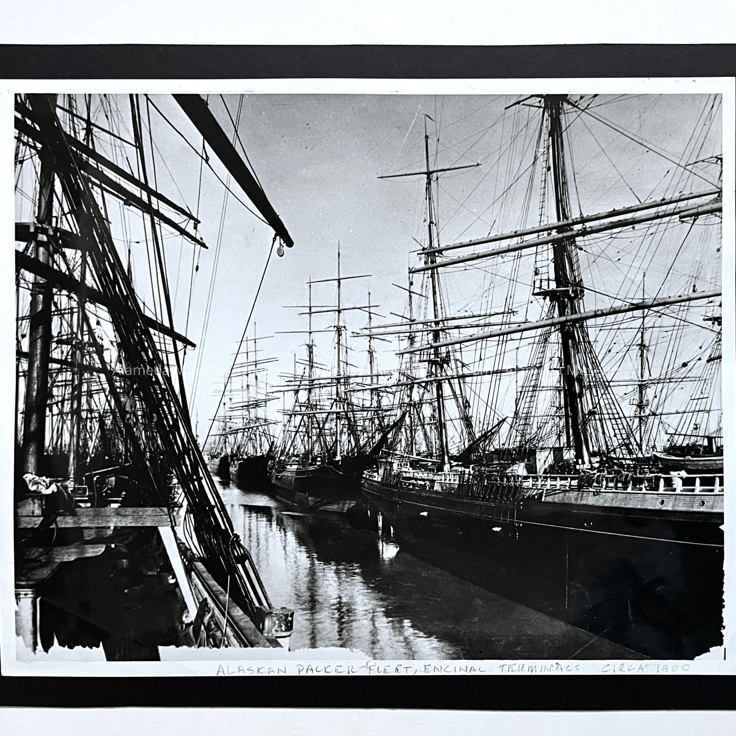 BLACK-AND-WHITE GLOSSY REPRODUCTION PHOTOGRAPH, MOUNTED ON BLACK-COLORED PAPER BACKGROUND. PHOTOGRAPH BEARS A HANDWRITTEN CAPTION, "ALASKA PACKERS FLEET, ENCINAL TERMINALS," CIRCA 1900's.