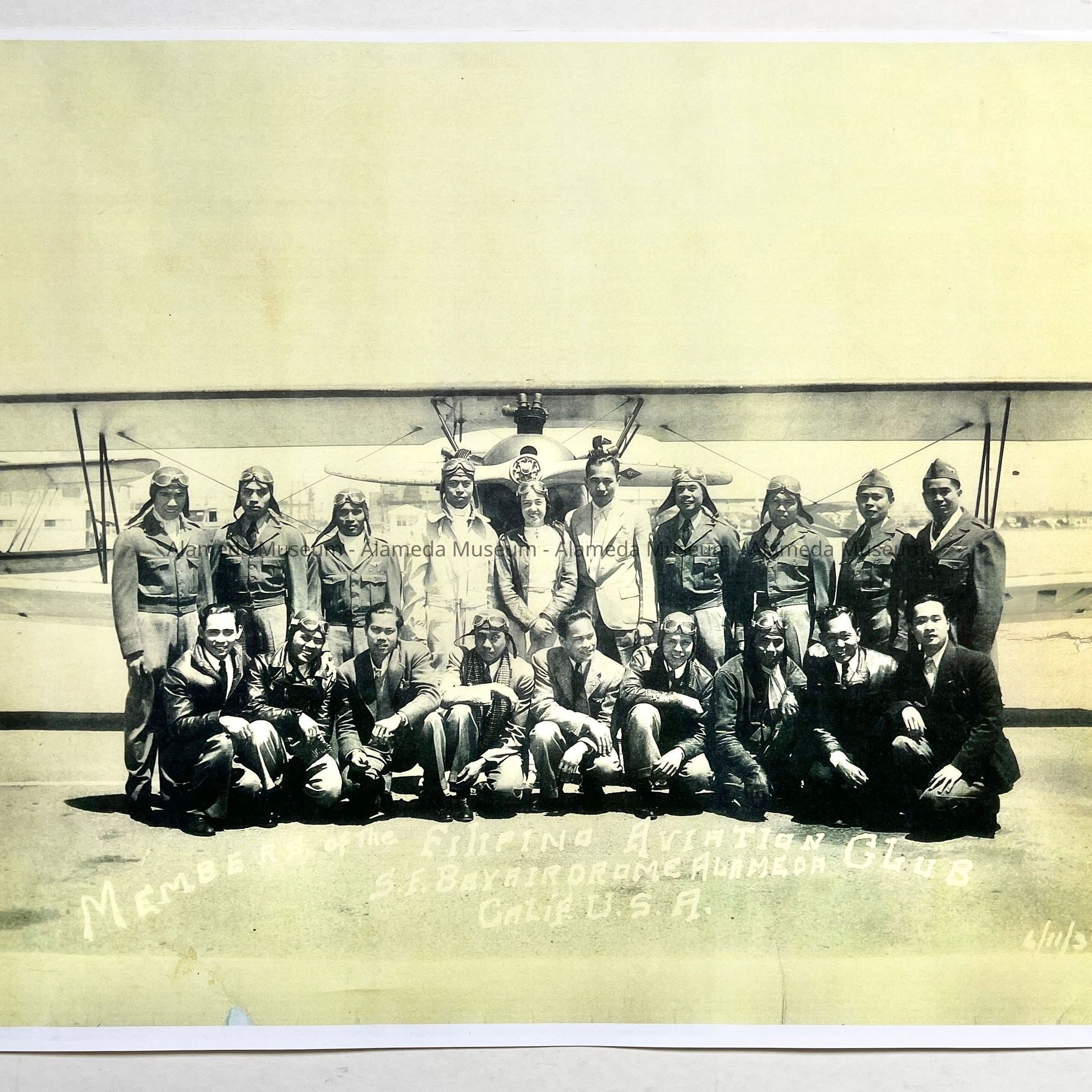DESCRIPTION: A COMPUTER-GENERATED COPY OF AN ORIGINAL PHOTOGRAPH. CAPTION READS, "MEMBERS OF THE FILIPINO AVIATION CLUB, SAN FRANCISCO BAY AIRDROME, ALAMEDA, CALIFORNIA, USA, JUNE 11, 1939."