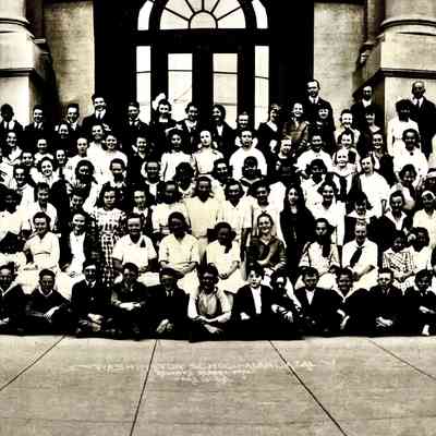 History of Object: A panoramic photo of the school staff and the entire student body of Washington elementary school, c. 1918.