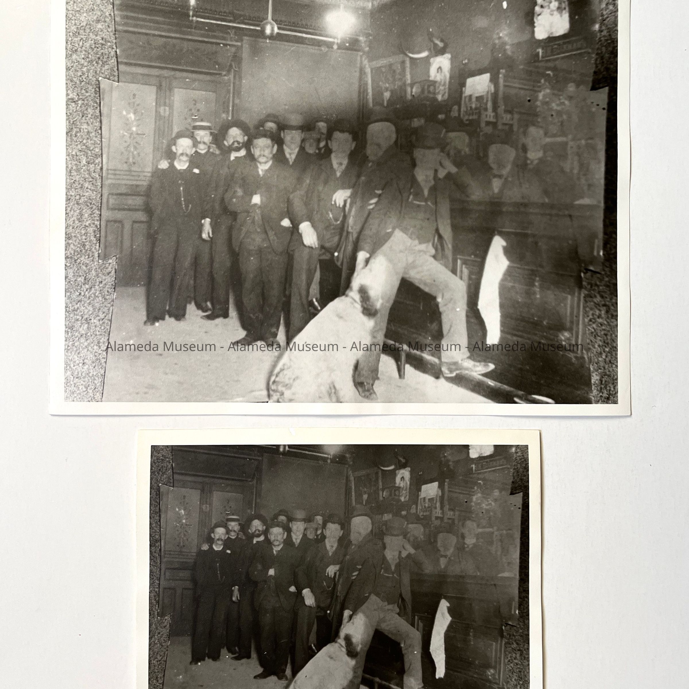 PHOTOGRAPH DEPICTING A GROUP OF INDIVIDUALS STANDING UP TO A BAR OF THE J N BECKMANN SALOON, ADJOINING A GROCERY STORE AT 1919 PACIFIC AVENUE, ALAMEDA; UNMOUNTED AND UNSIGNED. SALOON'S ADDRESS COULD BE 1917 PACIFIC AVE.