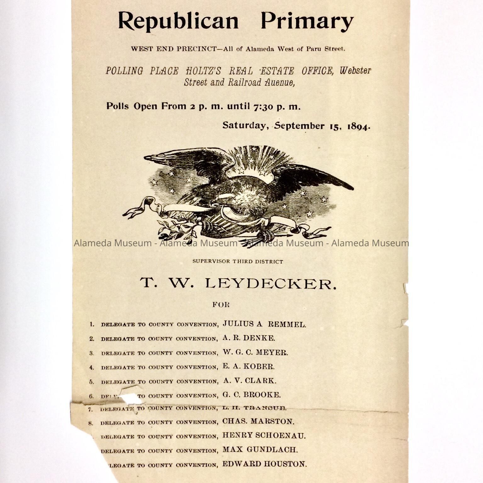 CANDIDATES' LIST FOR WEST END PRECINCT, SEPTEMBER 5, 1894 ELECTION. NAMES OF MANY PROMINENT EARLY ALAMEDANS ARE INCLUDED.