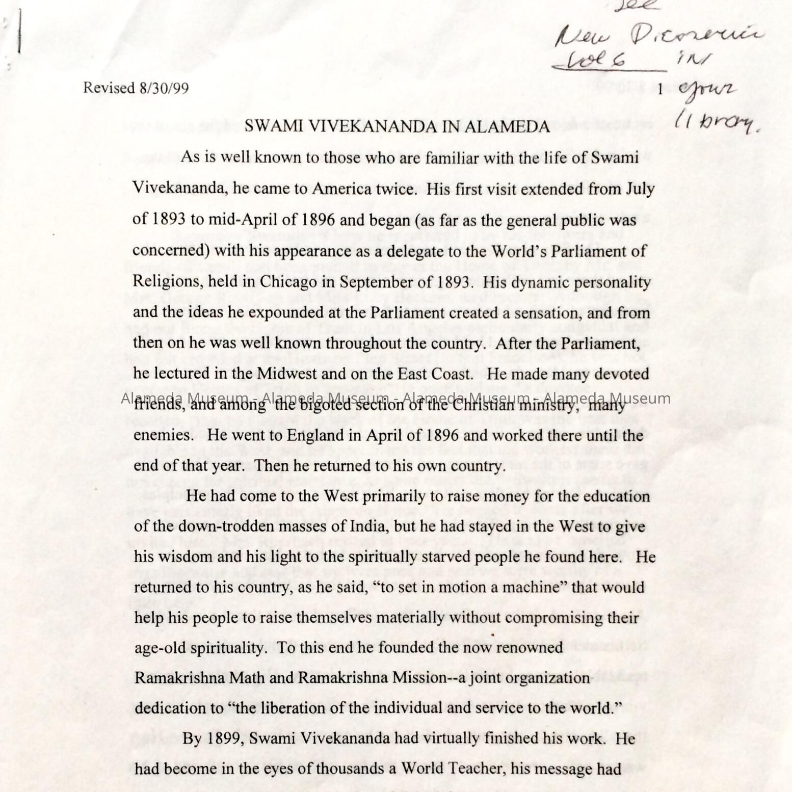 Research paper about 1900 visit of Swami Vivekananda, 1999Entry/Object ID