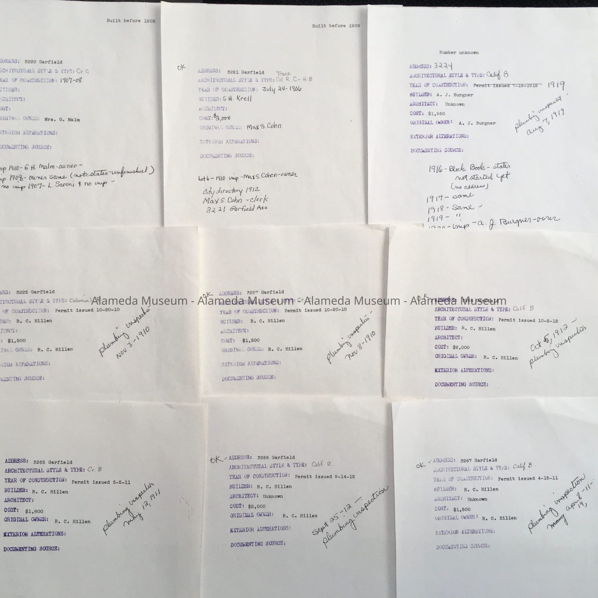 History of Object: Pages researching the history of Garfield Ave; Mr. Gunn lived on Garfield. The pre-formatted pages describe the historic information of a number of homes in a format similar to that used in George's books, listing the history of 3220, 3221, 3224, 3225, 3227, 3264, 3265, 3266, and 3267 Garfield Ave. The typed history appears a draft version of the one included in 23.43.19.