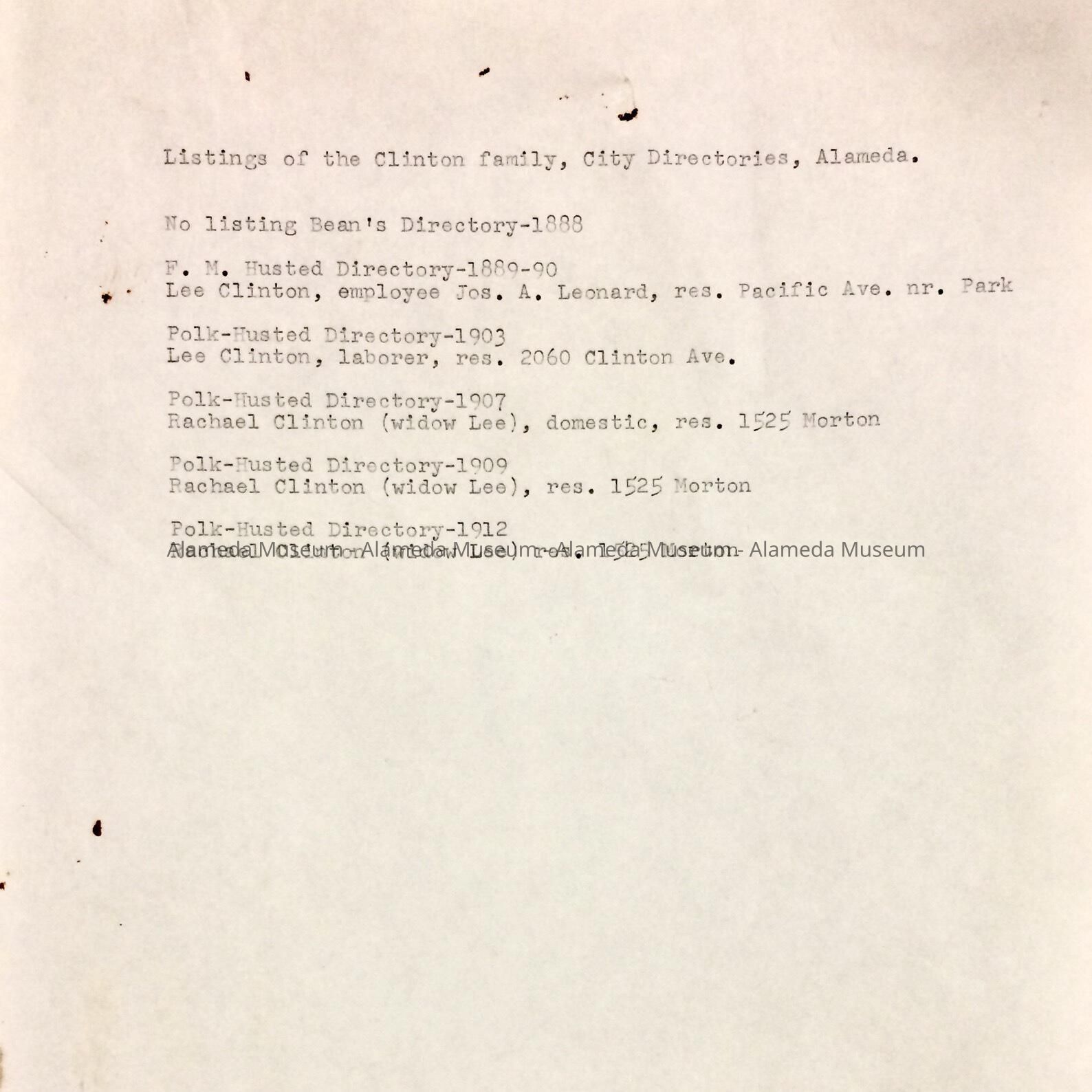 B. typed list of information gleaned from Directories (Polk's), about the Clinton family.