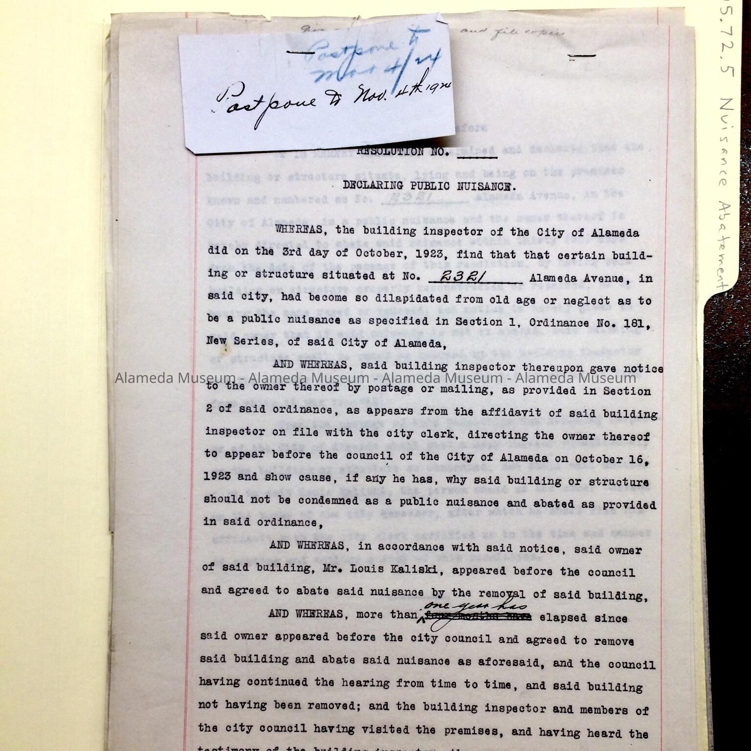 Resolution notice to abate nuisance, for 2317 and 2321 Alameda Ave, c. 1925-1935Entry/Object ID