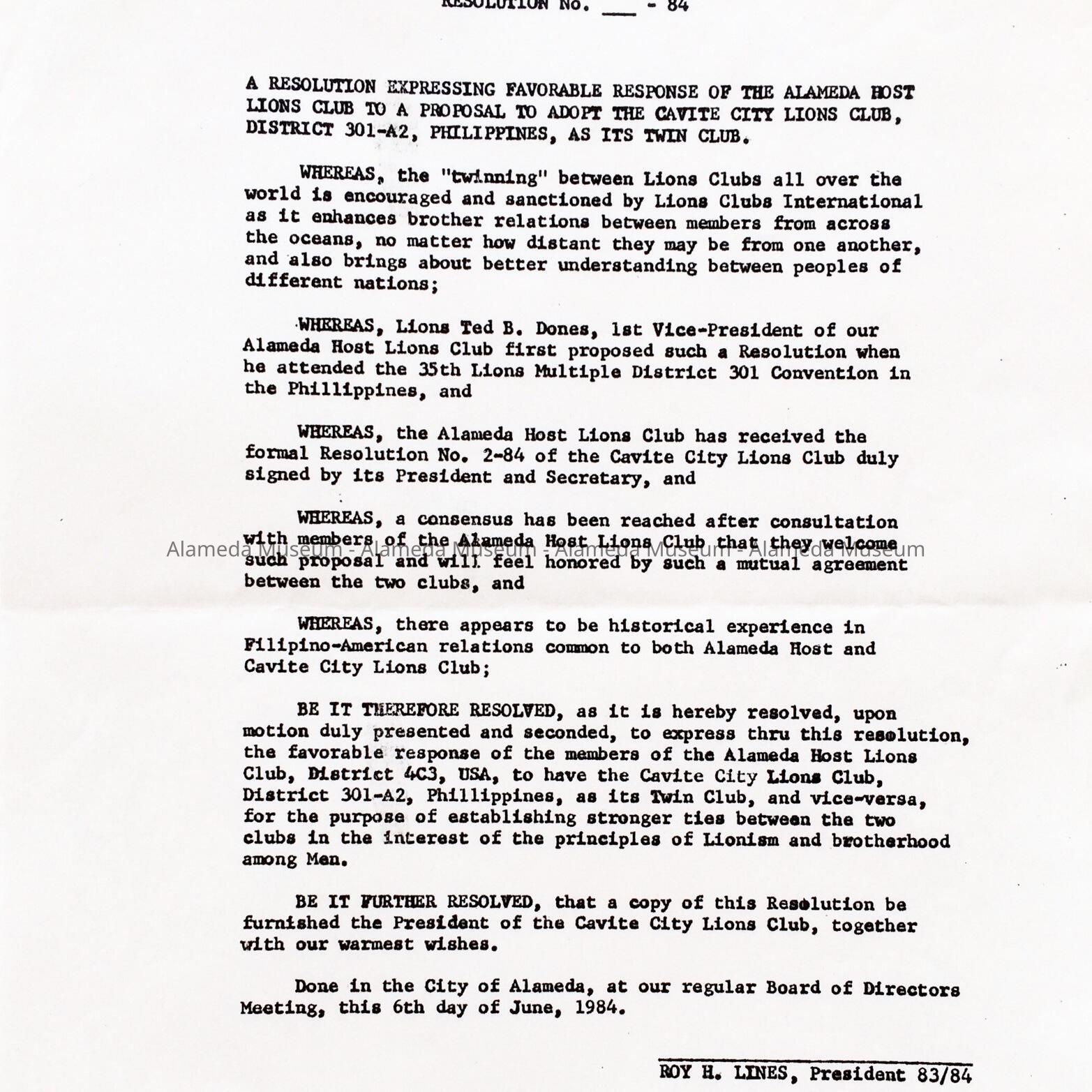 History of Object: photocopy of an unsigned 1984 Resolution of the Alameda Lions Club to adopt the Cavite Lions Club, District 301-A2, Philippines, as its Twin Club.