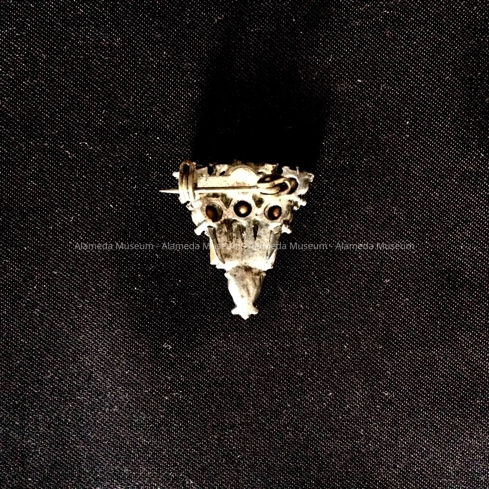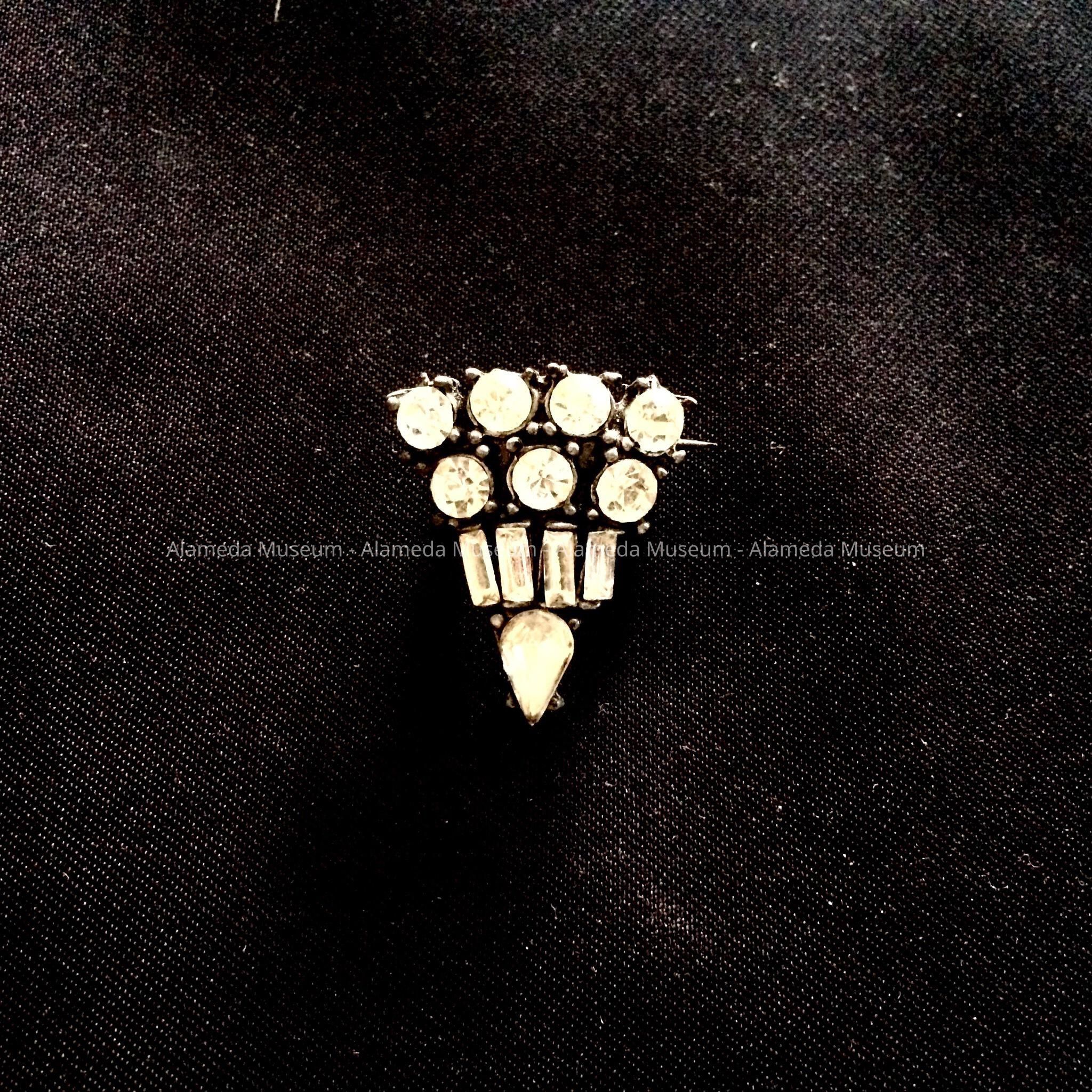 Description: triangular brooch, with 7 diamond-cut rhinestones, 4 bar-style rhinestones, and one teardrop-shaped rhinestone, with verso showing setting metal was lead. Pin with rotating lock is affixed on verso. One of the bar stones is set at an angle.