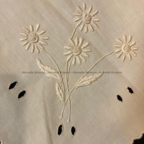 Description: Ribbed cotton (possibly a linen bag) which appears to be both machine and embroidered with scalloped edging. Embroidery consists of daisies and leaves.