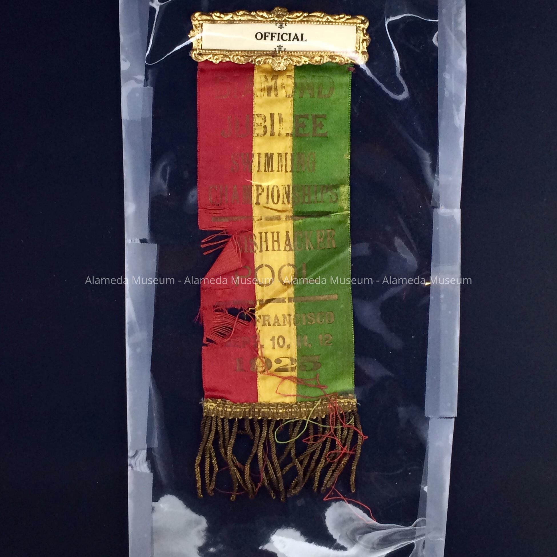 A RIBBON AWARDED TO BUNNY FERGUS, CHAMPION SWIMMER, AT A CHAMPIONSHIP EVENT HELD IN SAN FRANCISCO IN 1925.