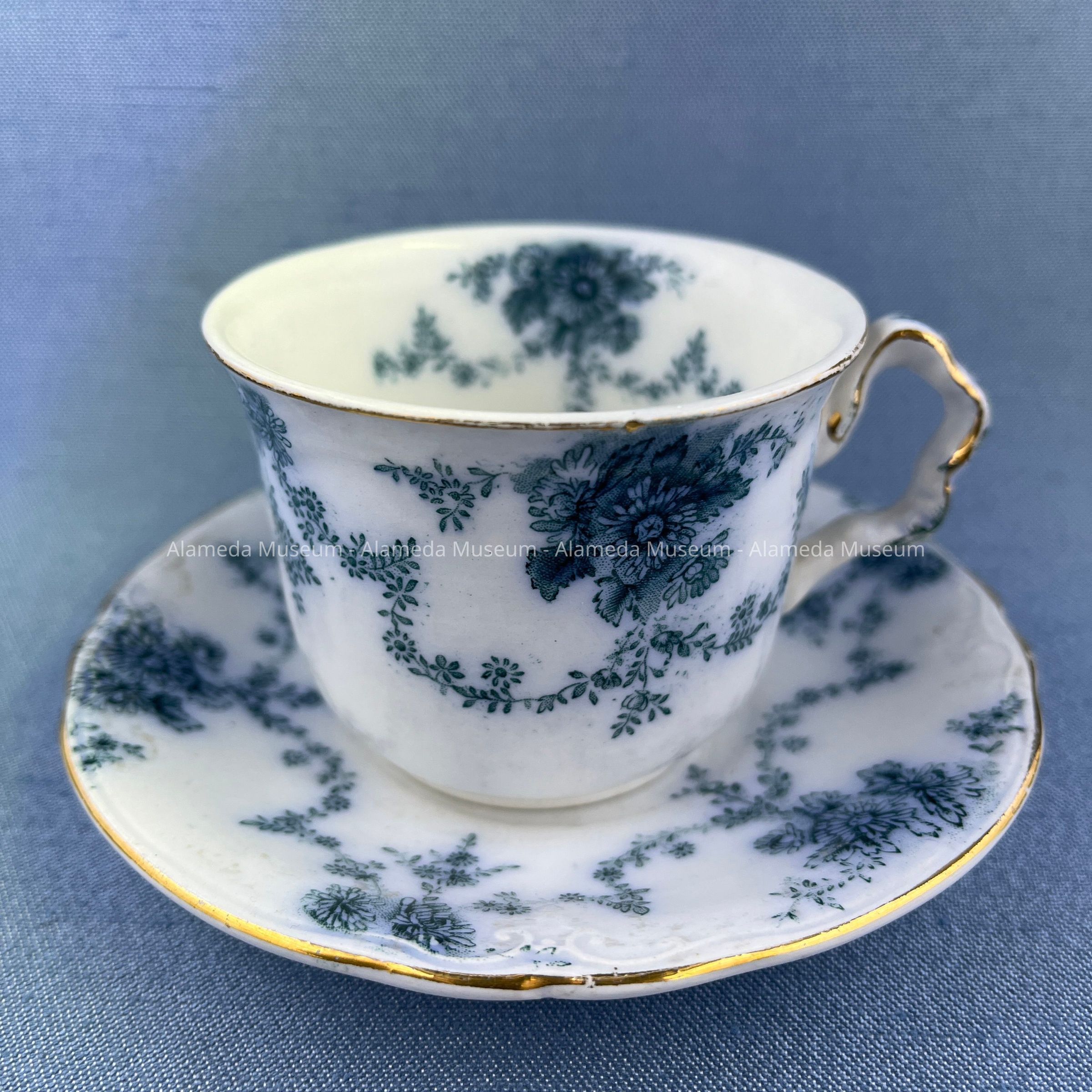 DESCRIPTION: A SEMI-PORCELAIN DEMITASSE-SIZE CUP AND SAUCER SET WITH A TRANSFER FLORAL SWAG IN A BLUE AND GREY COLORED DESIGN. THE SAUCER IS SIGNED, "RIDGWAY ROYAL SEMI-PORCELAIN, ENGLAND."